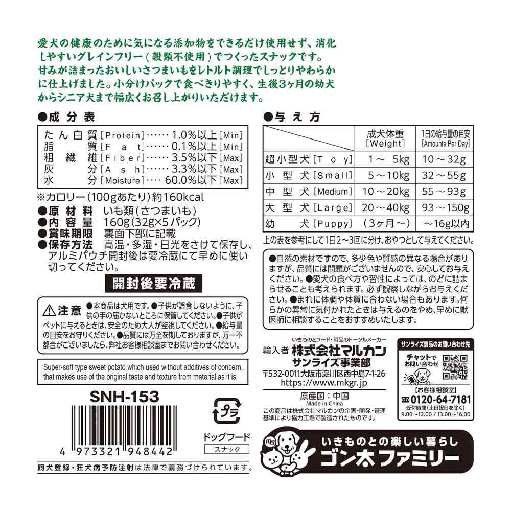 【原材料】いも類(さつまいも)【成分】たん白質:1.0%以上、脂質:0.1%以上、粗繊維:3.5%以下、灰分:3.3%以下、水分:60.0%以下