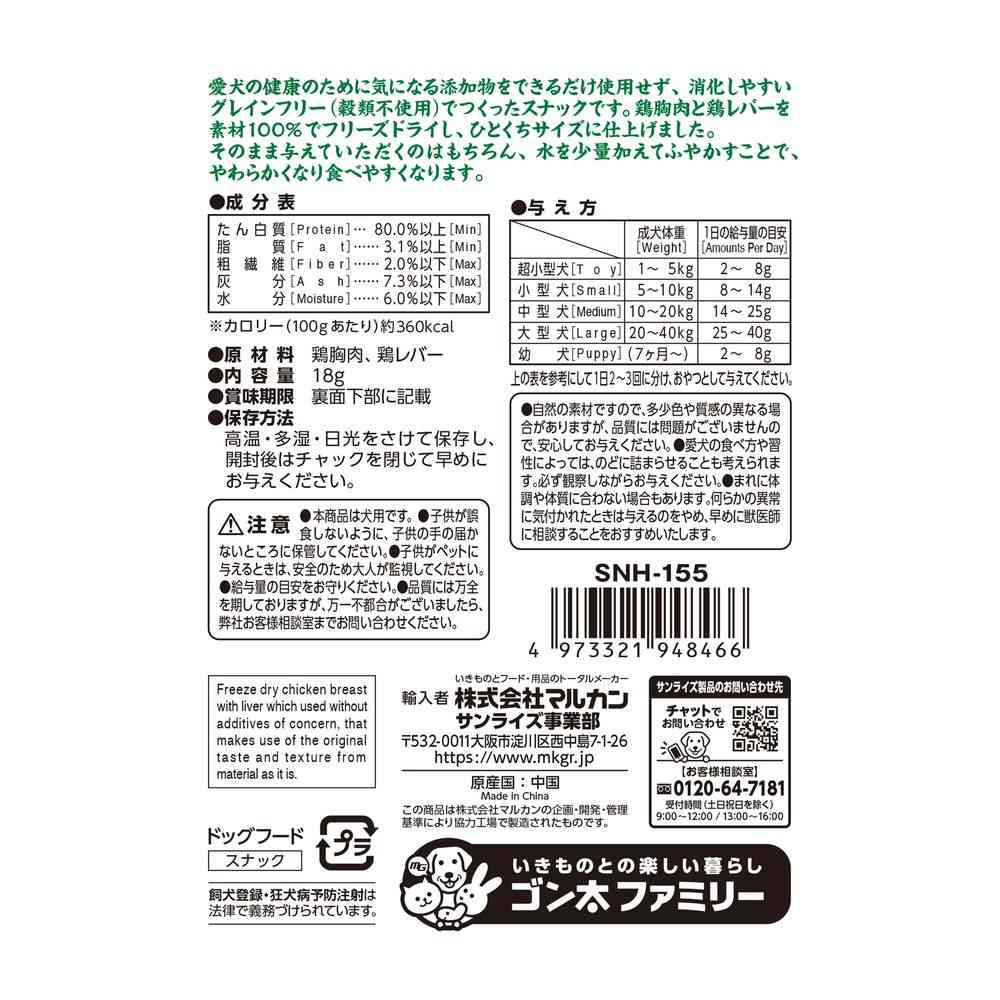 【原材料】鶏胸肉、鶏レバー【成分】たん白質:80.0%以上、脂質:3.1%以上、粗繊維:2.0%以下、灰分:7.3%以下、水分:6.00%以下