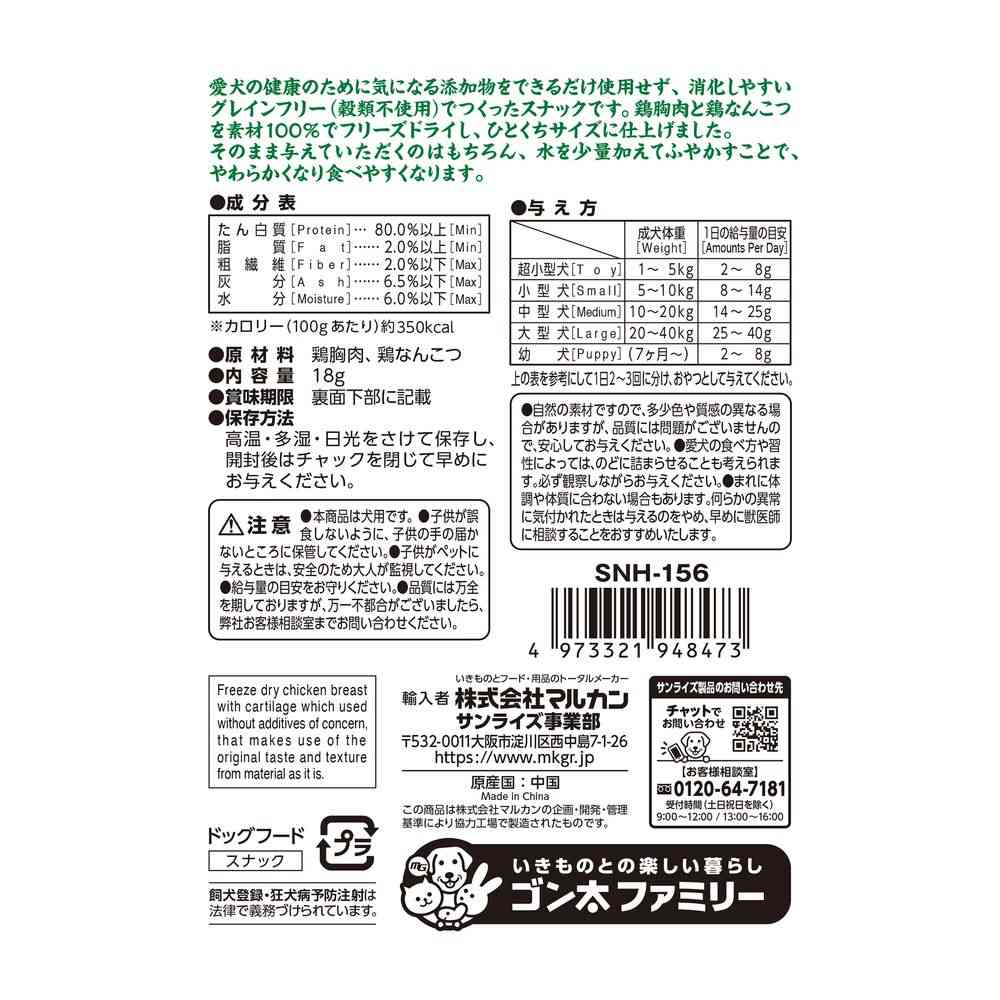 【原材料】鶏胸肉、鶏なんこつ【成分】たん白質:80.0%以上、脂質:2.0%以上、粗繊維:2.0%以下、灰分:6.5%以下、水分:6.00%以下