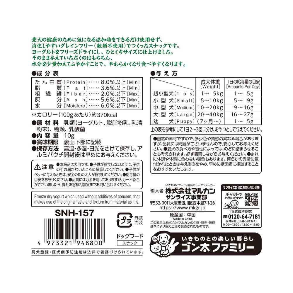 【原材料】乳類(ヨーグルト、脱脂粉乳、乳清粉末)、糖類、乳酸菌【成分】たん白質:8.0%以上、脂質:3.6%以上、粗繊維:2.0%以下、灰分:5.6%以下、水分:6.0%以下
