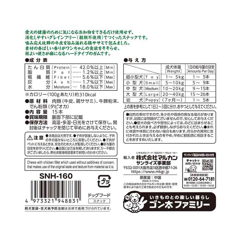 【原材料】肉類(牛皮、鶏ササミ)、牛蹄粉末、でん粉類(タピオカでん粉)【成分】たん白質:42.0%以上、脂質:1.2%以上、粗繊維:5.6以下、灰分:1.7%以下、水分:18.0%以下
