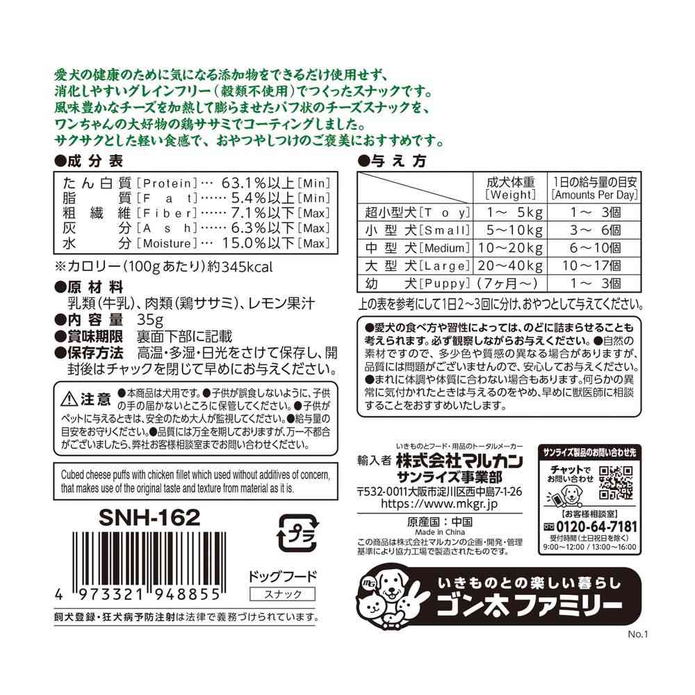 愛犬を想う「4つの無添加」。 素材の旨味を閉じ込めたサクサクのチーズパフ「ナチュラハグレインフリーパフ」シリーズは、愛犬の健康のために気になる添加物(保存料・酸化防止剤・発色剤・着色料)をできるだけ排除してつくったこだわりのスナックです。 消化のしやすさを考えた「グレインフリー(穀類不使用)」のレシピを採用し、風味豊かなチーズを加熱して膨らませることで、驚くほど軽い「サクサク食感」に仕上げました。 素材本来のまろやかな旨味が広がる「チーズパフ」と、大好物のササミをプラスした「鶏ササミチーズパフ」の2種類をご用意。 ひとくちサイズでおやつにはもちろん、しつけのご褒美としても最適です。 大切な家族である愛犬に、安心と美味しさを一粒ずつ手からお届けください。