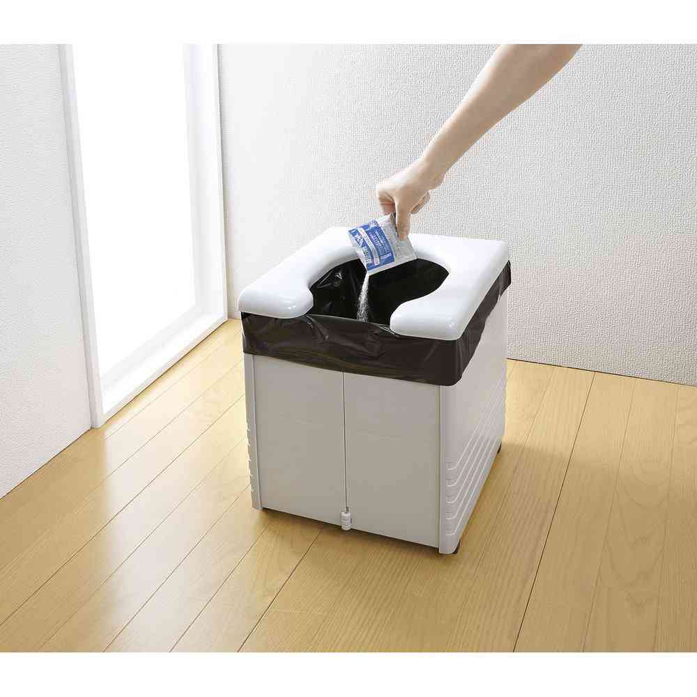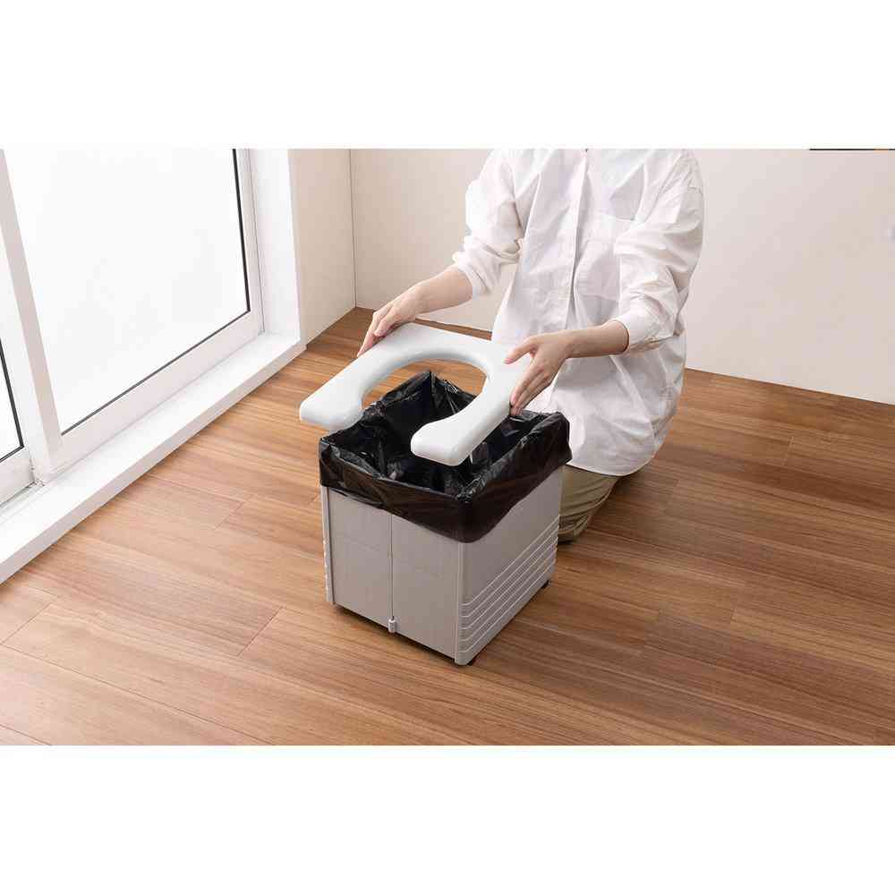 介護の現場や災害時に活躍する簡易トイレです。 本体を広げて便座をのせるだけの簡単設計で、急な時でもすぐに組み立てができます。 プラスチック成形でできているので水に濡れても使用できます。 本体を開いて、補強板で固定し、便座をのせるだけで簡単に組み立てできます。 折りたたみ式ですので持ち運びに便利です(外装箱を収納箱として使用できます)。 男性でも使用しやすいU型便座です。約150kgの体重まで支えることができます。 本体にゴムキャップが付いていますので、床を傷めません。汚れた場合は水洗いできます。 凝固剤、汚物袋は10回分をセット。 【耐荷重】150kg