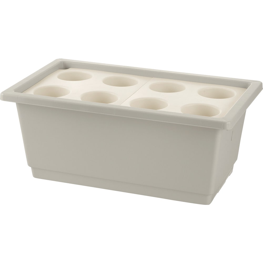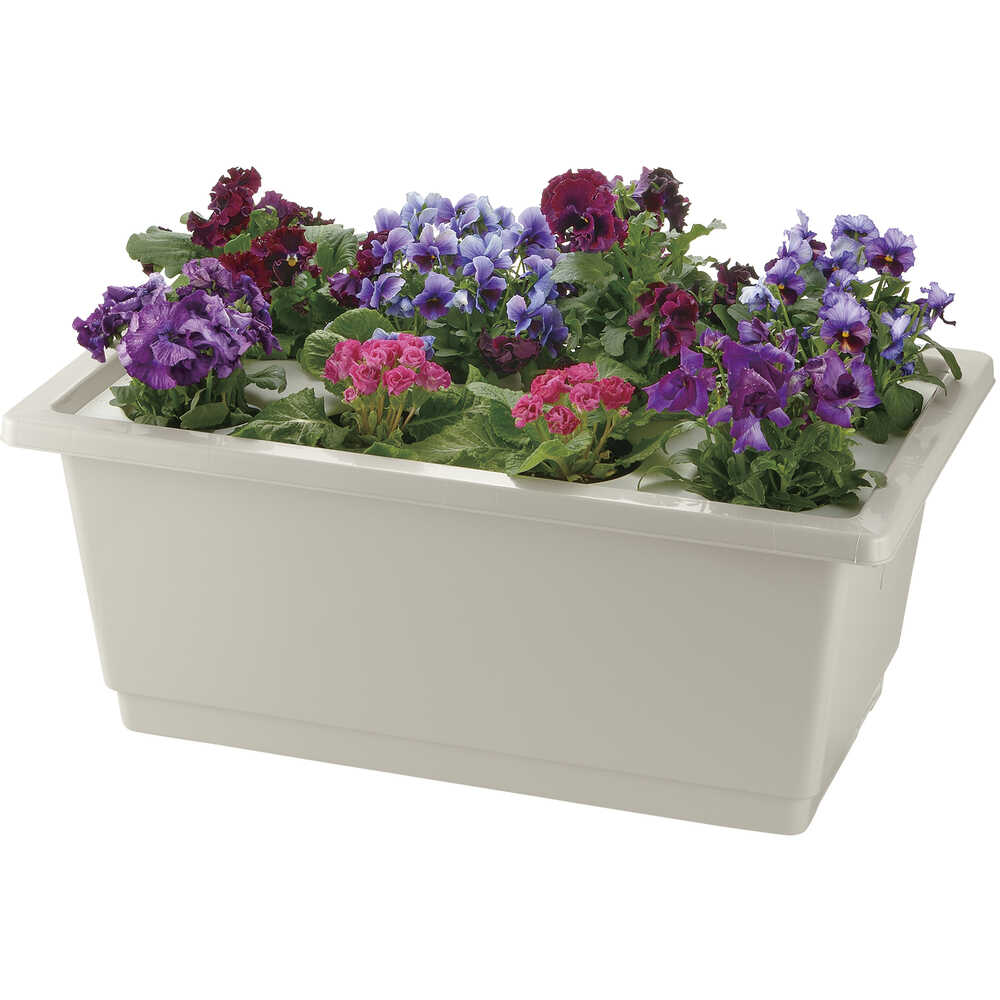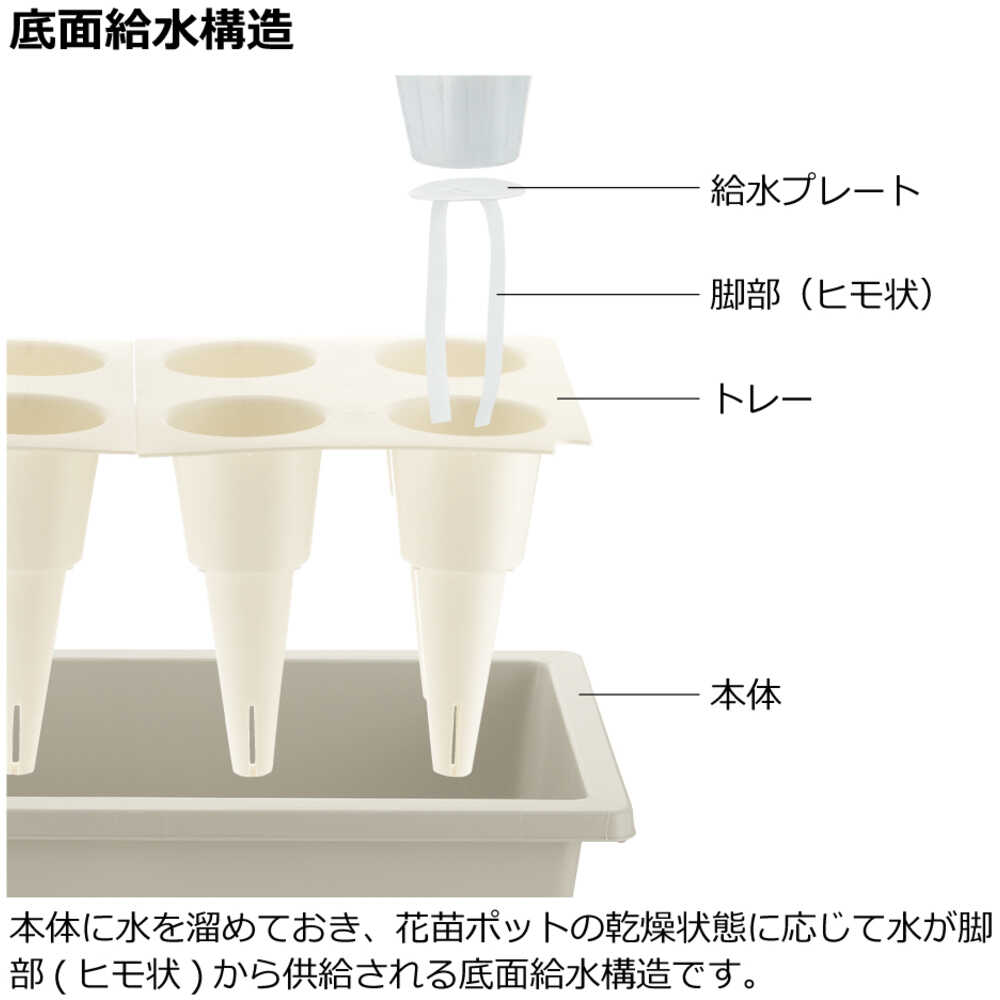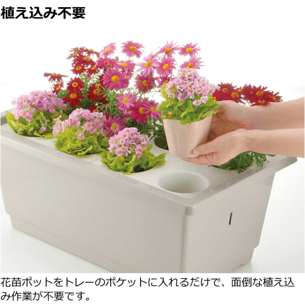 ●花苗ポット(3.5号)をポケット部にセットし、あとは貯水部に水を補給するだけで設置が完了する簡易型底面給水プランターです。●面倒な植え替え作業も土の廃棄も不要なので、花苗の交換が容易にできます。●下部に水を溜めておき、ポットの乾燥状態に応じて水が供給される底面給水タイプなので、毎日水やりする必要がありません。●給水布・底面プレートを外せば、直接土をいれることもできます。●幅(mm):680●奥行(mm):405●高さ(mm):280●土の容量(L):6.5(花苗ポットを使わない場合)●色:グレー 質量1900g
