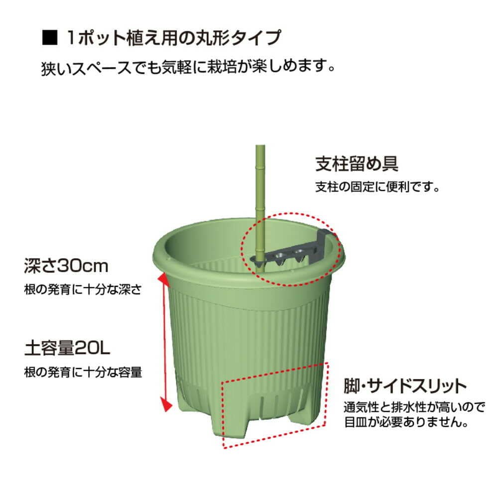 果菜を上手に育てる機能が充実。1ポット植え用の丸型タイプ。 狭いスペースでも気軽に栽培が楽しめます。
