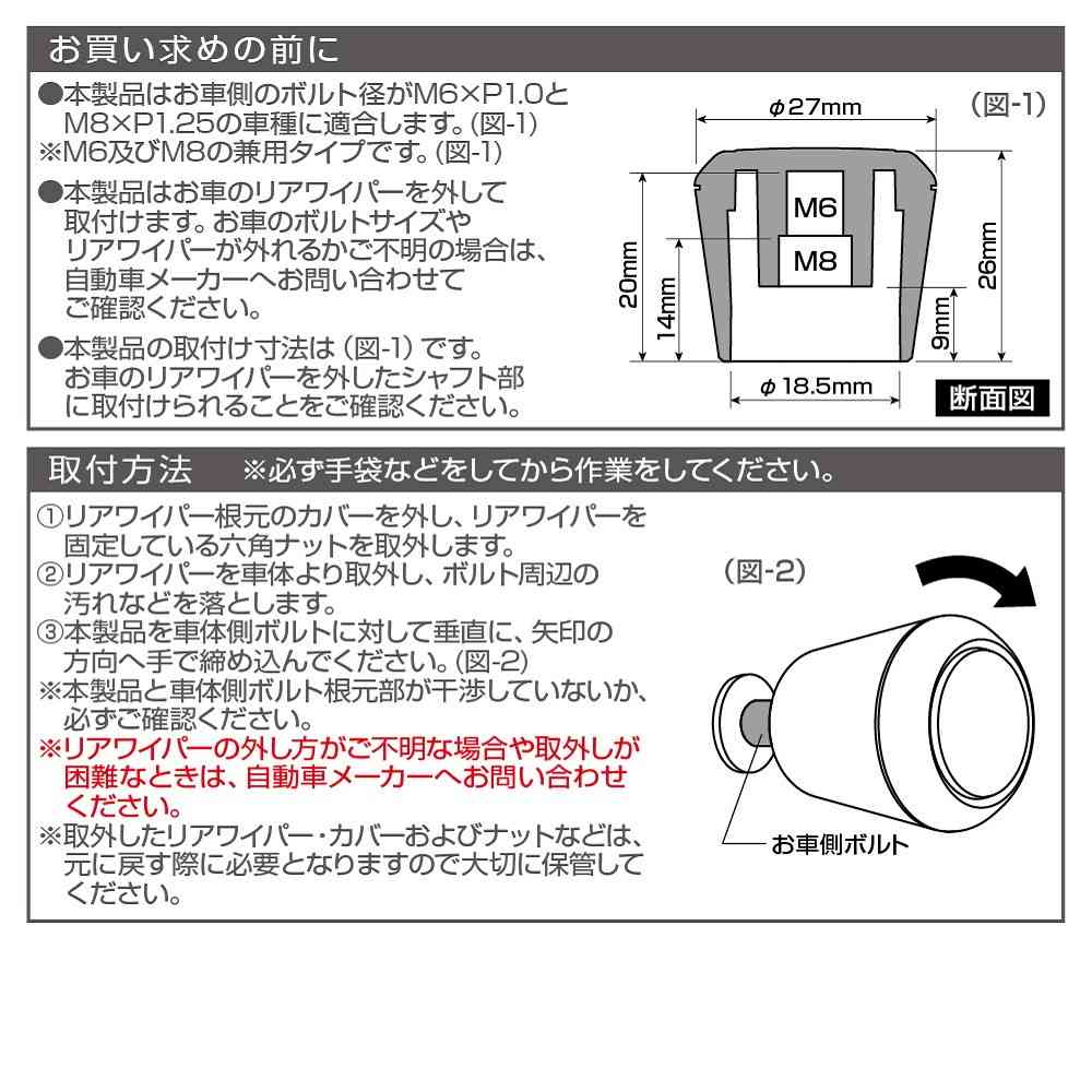 ●リアワイパーを外して取付けるドレスアップ用のリアワイパーキャップです。 ●カーボン調ボディが愛車のリアビューをスポーティに魅せます。 ●シャフト部を目立たせないデザインでリアビューのスムージング化に最適です。