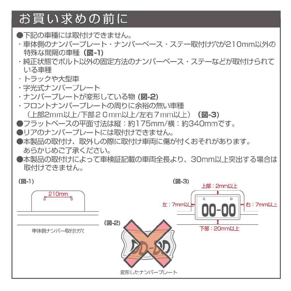 ●約5°の傾斜角でフロントフェイスをスタイリッシュに演出するドレスアップ用ナンバーベースです。 ●テーパードトップでバンパーとの一体感が得られます。 ●フラットベースで好みのナンバーフレームが取付け可能です。 ●ナンバープレートを曲がり、歪みから保護します。 ●普通車・軽自動車のフロントナンバー専用です。