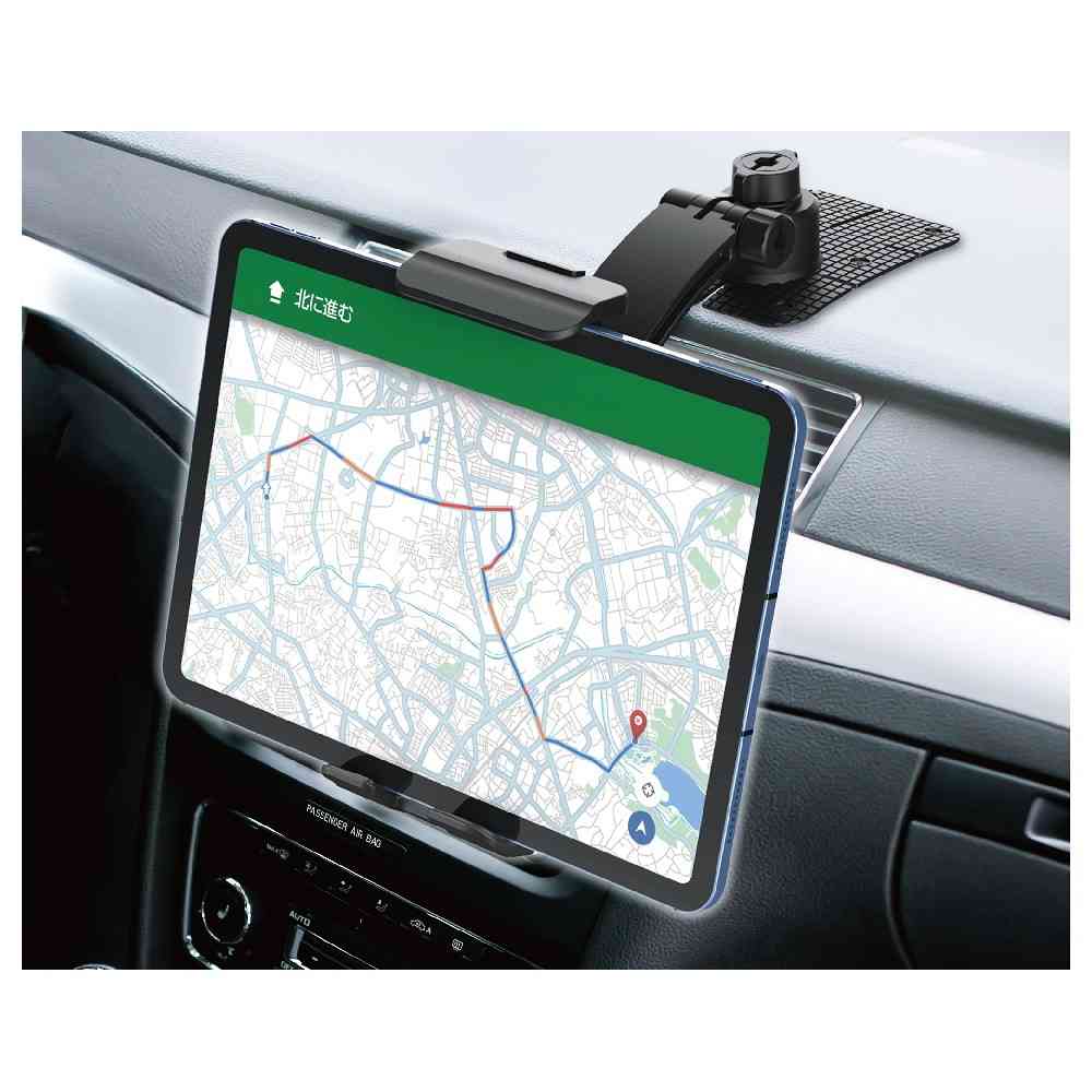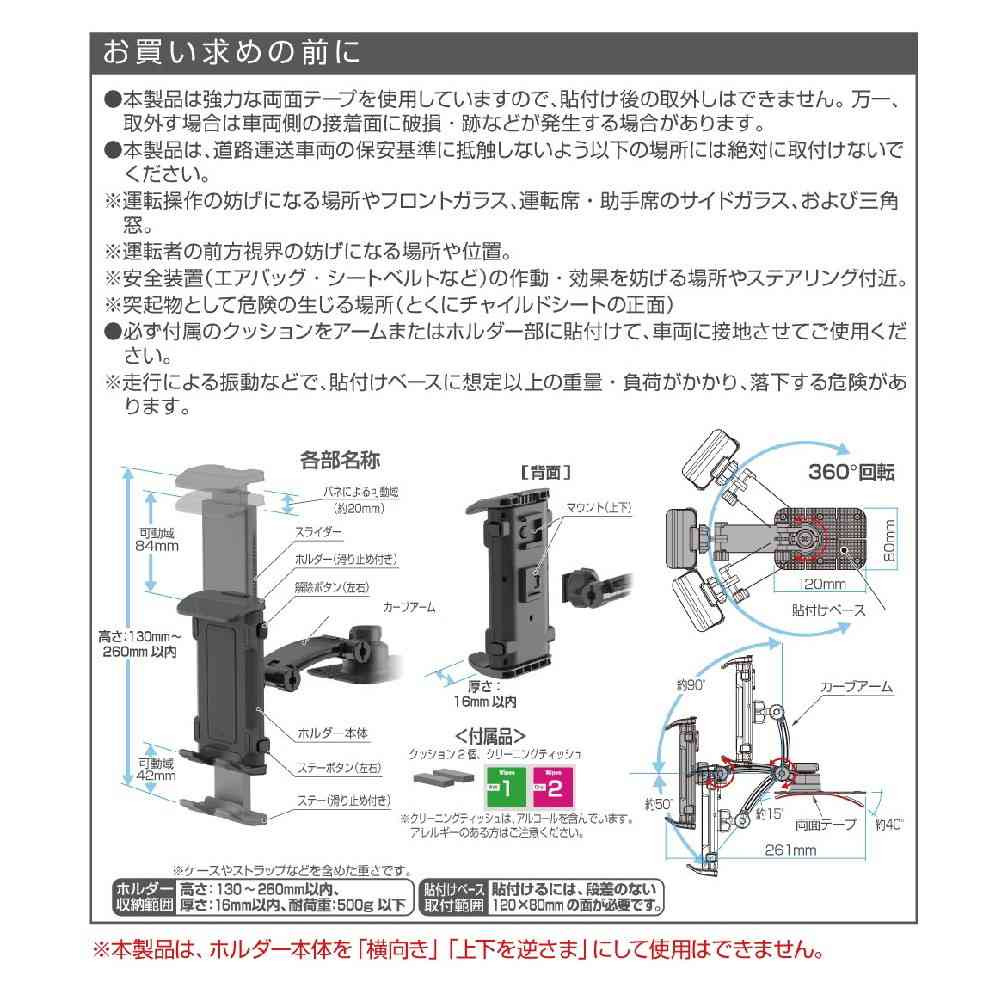 ●ダッシュボードなどの曲面へ貼付けられるタブレットホルダーです。 ●強力両面テープ付きの貼付けベースは、やわらか素材でしっかりと取付けることが可能です。 ●貼付け後も水平方向に360°向きを変更できる回転機構(任意の向きでロック可能)を搭載しています。 ●カーブアームでローダウンできるので、前方視界を良好に保てます。 ●スマートフォン(縦置き)から11インチのタブレットまで挟めます。