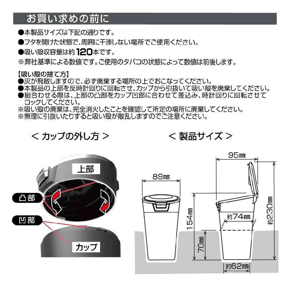 ●車内での使いやすさにこだわったソーラーライト付き多機能灰皿です。 ●「灰づまり自動クリーニング消火穴」をはじめ、車載用灰皿に特化した12の機能を備えています。 ※詳しくはパッケージ側面をご参照ください。 ●ドリンクホルダーに収まりの良いテーパードデザインです。