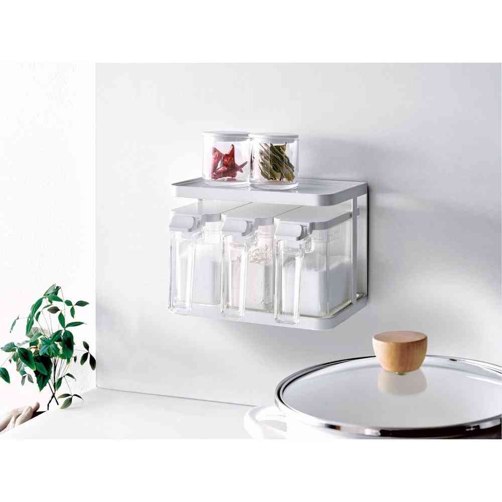 密閉プッシュポットS3個とマグネットラックのセットです。 ラックの背面にマグネットがついた調味料ラックと、そこにピッタリ収まる密閉調味料ポット(450ml)が3個ついたセットです。 ラックはマグネット付きなので置き型使用だけでなく、壁への取り付けも可能です。 調味料ポットは湿気を防ぐパッキンに加え、カチッと閉まるロックでしっかり「密閉仕様」。 ワンプッシュオープンで使いやすい。 計量スプーン付きですり切り板を使えば、小さじ1、小さじ1/2の計量も簡単にできます。 すり切り板にスプーンがセット出来るので、スプーンが埋もれない清潔構造です。 ※すり切り板は取り外して洗えます。 耐荷重:マグネット取り付け時<下段>約2kg+<上段>約1kg/置いて使う時:<下段>約2kg +<上段>約2kg ●容量(ポット1つあたり):450ml ●付属品:シール ●取り付けられるところ:磁石のつく平らな面(冷蔵庫・洗濯機などの金属塗装面、ホーロー流し台、スチール製品等) ●取り付けられないところ:磁石のつかない面、凹凸や湾曲面
