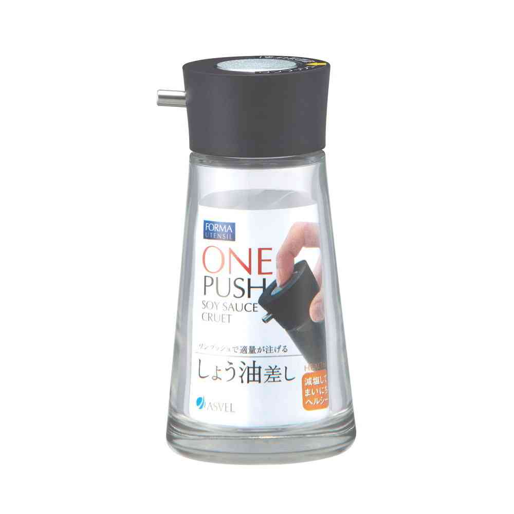 プッシュタイプで適量注げる醤油差し。 出し量調節自在、一滴も小皿分も簡単に注げます。