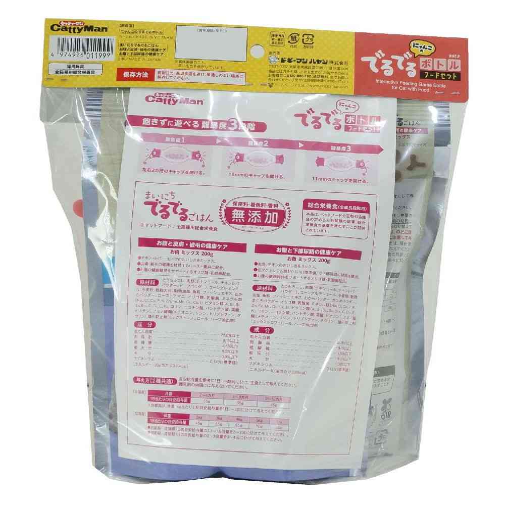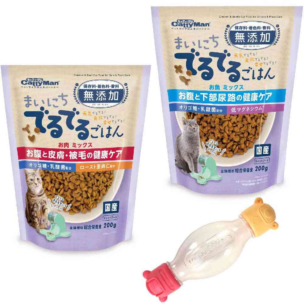 【でるでるボトル】 ●用途・対象を守る。 ●幼児の手の届く所で使用・保管しない。 ●火気の近く・階段のそば・倒れやすい物のそばで使用しない。 ●子供が使用する場合は、安全のため大人が立ち会う。 ●誤飲防止のため(特に幼猫は注意)次のことを守る。 ○使用前に傷み具合を点検し、傷みが目立つ場合は使用しない ○ペットの性格やクセ・体調などをよく理解したうえで遊ばせる ○必ず人前で遊ばせる ○長く噛み続けているときは一度おもちゃを離し、傷みが目立ちはじめたら使用をやめる ○遊び終えたらペットが触れない所に保管する ○万一、誤飲した時は、すぐに獣医師に相談する。 ○ぺットに噛ませない ○使用後はペットが触れない所に保管する ○万一、誤飲したときは、すぐに獣医師に相談する。 【でるでるごはん】 ●ペットフードとしての用途をお守りください。 ●幼児や子供、ペットの触れない場所で保存してください。 ●記載表示を参考に、ペットが食べ過ぎないようにしてください。 ●必ず様子を見ながら与えてください。 ●子供がペットに与えるときは、安全のため大人が立ち会ってください。 ●ペットが興奮したりしないよう、落ち着いた環境で与えてください。 ●ペットの体調が悪くなったときには、獣医師に相談してください。