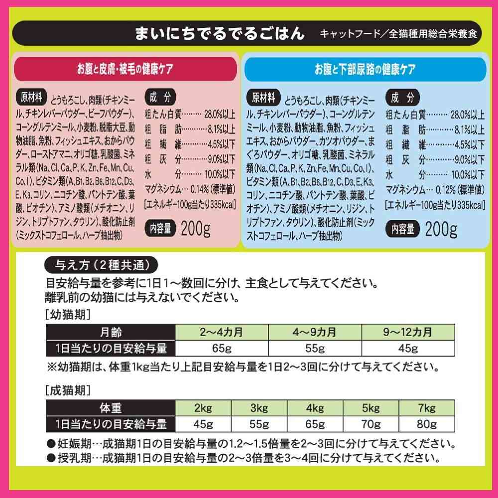 【お腹と皮膚・被毛の健康ケア】とうもろこし、肉類(チキンミール、チキンレバーパウダー、ビーフパウダー)、コーングルテンミール、小麦粉、脱脂大豆、動物油脂、魚粉、フィッシュエキス、おからパウダー、ローストアマニ、オリゴ糖、ミネラル類(Na、Cl、Ca、P、K、Zn、Fe、Mn、Cu、Co、I)、ビタミン類(A、B1、B2、B6、B12、C、D3、E、K3、コリン、ニコチン酸、パントテン酸、葉酸、ビオチン)、アミノ酸類(メチオニン、リジン、トリプトファン、タウリン)、酸化防止剤(ミックストコフェロール、ハーブ抽出物)【お腹と下部尿路の健康ケア】とうもろこし、肉類(チキンミール、チキンレバーパウダー)、コーングルテンミール、小麦粉、動物油脂、魚粉、フィッシュエキス、おからパウダー、カツオパウダー、まぐろパウダー、オリゴ糖、乳酸菌、ミネラル類(Na、Cl、Ca、P、K、Zn、Fe、Mn、Cu、Co、I)、ビタミン類(A、B1、B2、B6、B12、C、D3、E、K3、コリン、ニコチン酸、パントテン酸、葉酸、ビオチン)、アミノ酸類(メチオニン、リジン、トリプトファン、タウリン)、酸化防止剤(ミックストコフェロール、ハーブ抽出物) 【お腹と皮膚・被毛の健康ケア】成分/粗たん白質:28%以上、粗脂肪:8.1%以上、粗繊維:4.5%以下、粗灰分:9%以下、水分:10%以下・エネルギー/335kcal/100g【お腹と下部尿路の健康ケア】成分/粗たん白質:28%以上、粗脂肪:8.1%以上、粗繊維:4.5%以下、粗灰分:9%以下、水分:10%以下・エネルギー/335kcal/100g