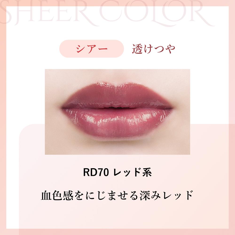 ●透け感発色で素唇に溶け込む、デイリー使いにおすすめの「透けつや」リップ。 ●カラー:RD70 レッド系 血色感をにじませる深みレッド ●【選べる3つの質感があるラスティングリップスティック】グロス・シアー・セミグロスの3タイプ展開。なりたいイメージや使用シーンに合わせお選びいただけます。 ●【透けつや質感のシアータイプ】ナチュラルで親しみやすい印象を与えたいときにおすすめの「シアー」。自然で肌になじみ、バランスの取れた仕上がりです。 ●【ダブルのうるおい成分配合】うるおいを抱える&守る、ダブルのうるおい成分※1を配合。さらに、保湿成分グリチルレチン酸ステアリルを配合し、唇のバリア機能をととのえ※2、乾燥を防ぎしっとり感を与えます。(※1 油性エモリエント成分:スクワラン、ラウロイルグルタミン酸ジ(フィトステリル/オクチルドデシル) ※2 口唇の荒れを防ぐ) ●【唇に密着するテクスチャー】すべり性のよい油剤※3を配合。なめらかにムラなくのびて、唇にぴたっと密着します。(※3 ジフェニルシロキシフェニルトリメチコン)
