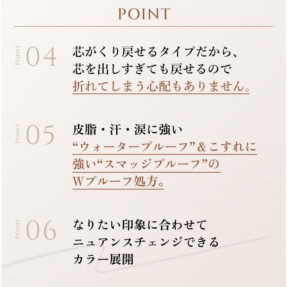●スルッと描けて長時間キープ。にじみにくく描きやすいジェルアイライナー。 ●カラー:BK32 ブラック 漆黒ブラック ●【するする描けるクリーミーフィット処方】やわらかい膜を作る成分※1と、すべりのよいワックス※2のバランスを追求した、するする描きやすいジェルアイライナーです。(※1 皮膜形成成分:(エチレン/プロピレン)コポリマー ※2 油性エモリエント成分:カルナウバロウ) ●【安定感のある描き心地】太すぎず細すぎない2mm芯を採用。安定した描き心地を実現。 ●【美しい仕上がりが長持ち】揮発しやすい油※3を配合したジェル処方で、塗布すると油が飛んで肌にしっかり密着。ラスティング成分※4が膜を作り、にじみにくく美しい仕上がりが持続します。(※3 基剤:水添ポリイソブテン ※4 ラスティング成分:トリメチルシロキシケイ酸) ●【Wプルーフ処方で落ちにくい】皮脂・汗・涙に強い「ウォータープルーフ」、こすれに強い「スマッジプルーフ」のWプルーフ処方です。 ●【芯がくり戻せるタイプ】削らずに使えて、芯を出しすぎても戻せるので折れてしまう心配もありません。
