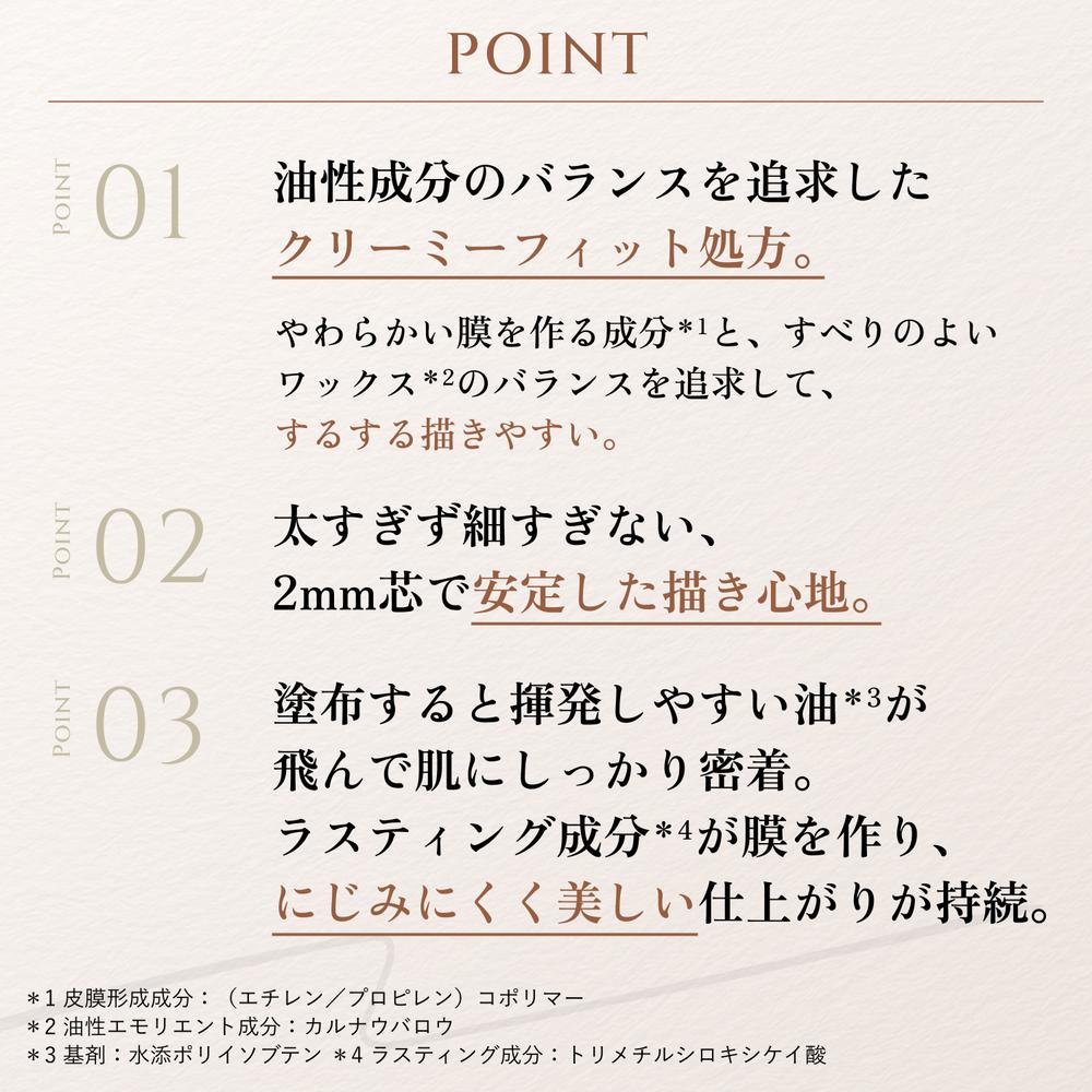 ●スルッと描けて長時間キープ。にじみにくく描きやすいジェルアイライナー。 ●カラー:BR26 ブラウン やわらかな王道ブラウン ●【するする描けるクリーミーフィット処方】やわらかい膜を作る成分※1と、すべりのよいワックス※2のバランスを追求した、するする描きやすいジェルアイライナーです。(※1 皮膜形成成分:(エチレン/プロピレン)コポリマー ※2 油性エモリエント成分:カルナウバロウ) ●【安定感のある描き心地】太すぎず細すぎない2mm芯を採用。安定した描き心地を実現。 ●【美しい仕上がりが長持ち】揮発しやすい油※3を配合したジェル処方で、塗布すると油が飛んで肌にしっかり密着。ラスティング成分※4が膜を作り、にじみにくく美しい仕上がりが持続します。(※3 基剤:水添ポリイソブテン ※4 ラスティング成分:トリメチルシロキシケイ酸) ●【Wプルーフ処方で落ちにくい】皮脂・汗・涙に強い「ウォータープルーフ」、こすれに強い「スマッジプルーフ」のWプルーフ処方です。 ●【芯がくり戻せるタイプ】削らずに使えて、芯を出しすぎても戻せるので折れてしまう心配もありません。