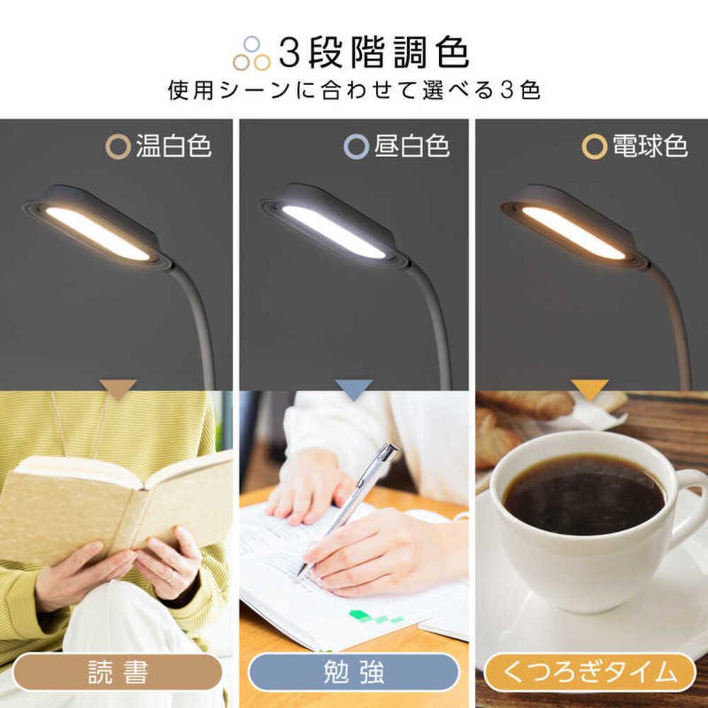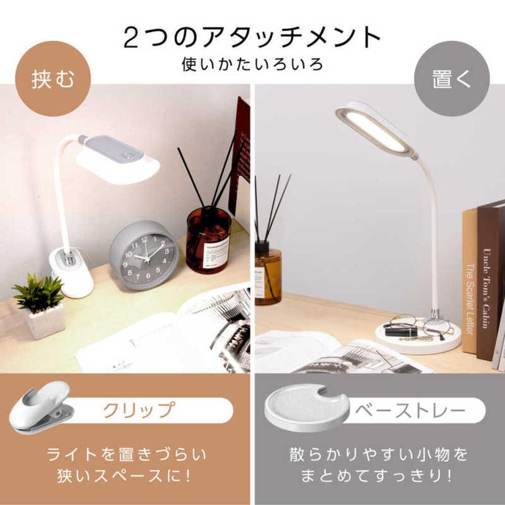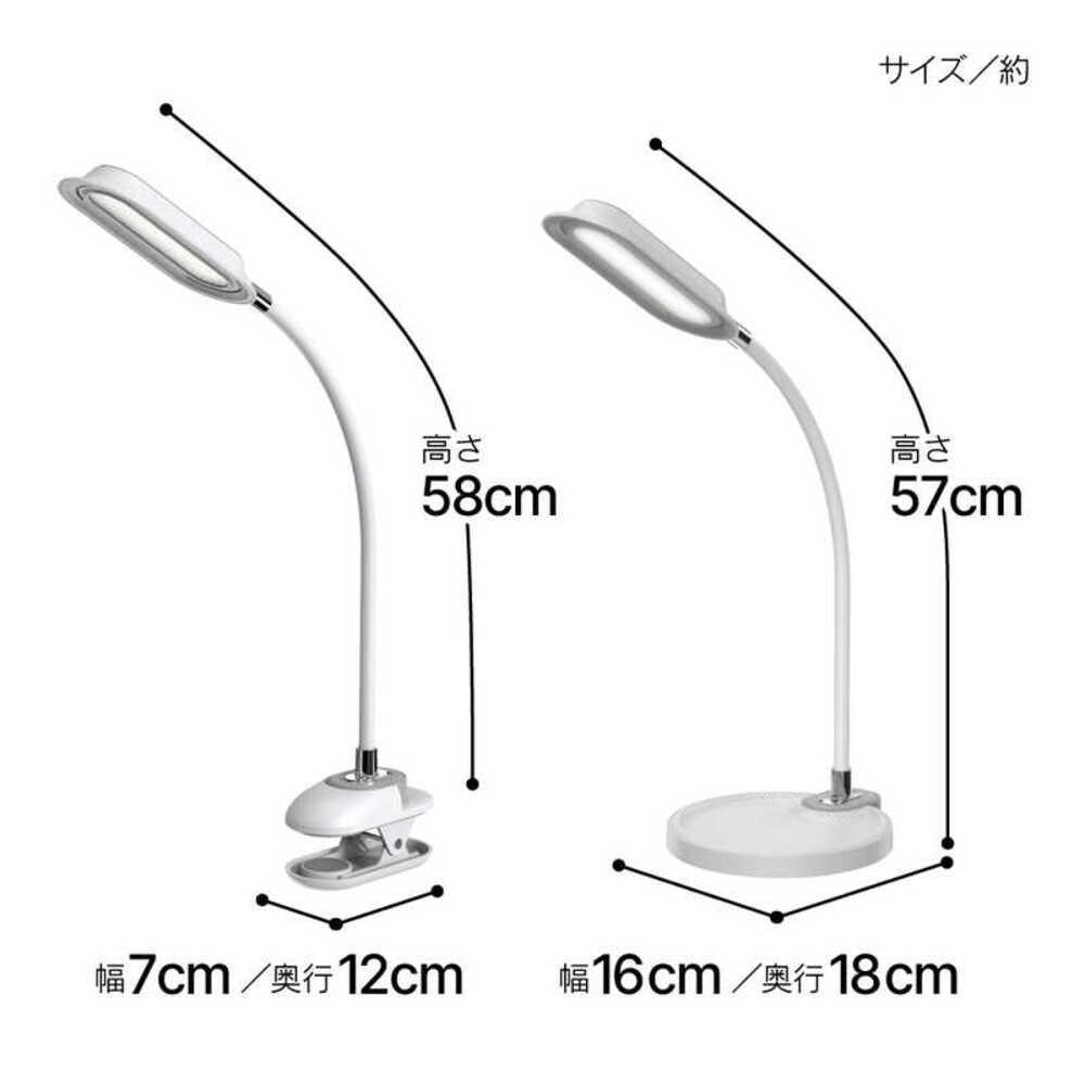 ●クリップ&ベーストレーの2WAYで使える ●アーム上部はフレキシブルに角度調節可能 ●3段階調色(温白色・昼白色・電球色) ●無段階調光 ●定格入力:DC12V1A ●定格消費電力:12W(電源アダプター含む) ●LED消費電力(約):7W(温白色)/4W(昼白色)/3W(電球色) ●調光:無段階 ●光束(約):440lm(温白色)/250lm(昼白色)/170lm(電球色) ●調色:3段階 ●色温度(約):3800K(温白色)/4700K(昼白色)/2900K(電球色) ●照度(約):2200lx(30cm直下・温白色・強光) ●LED寿命(約):30,000時間 ●使用温度範囲:5℃~45℃