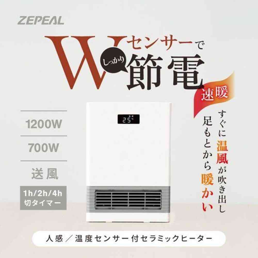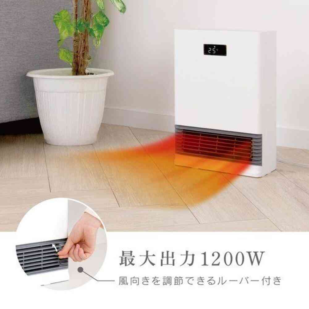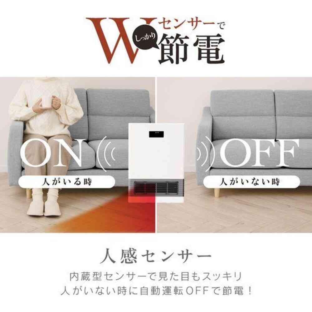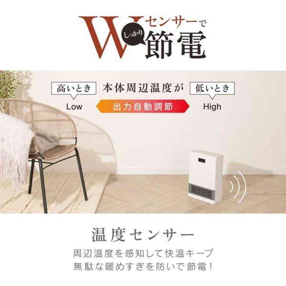 ●人感センサー搭載 ●温度センサー搭載(18℃~30℃の範囲で設定可能) ●3段階出力切替(1200W・700W・送風) ●3段階切タイマー(1h・2h・4h) ●切り忘れ防止機能(8時間後自動OFF) ●チャイルドロック付き