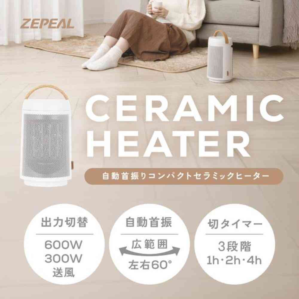 ●左右自動首振り ●3段階出力切替(600W・300W・送風) ●3段階切タイマー(1h・2h・4h) ●切り忘れ防止機能(8時間後自動OFF)