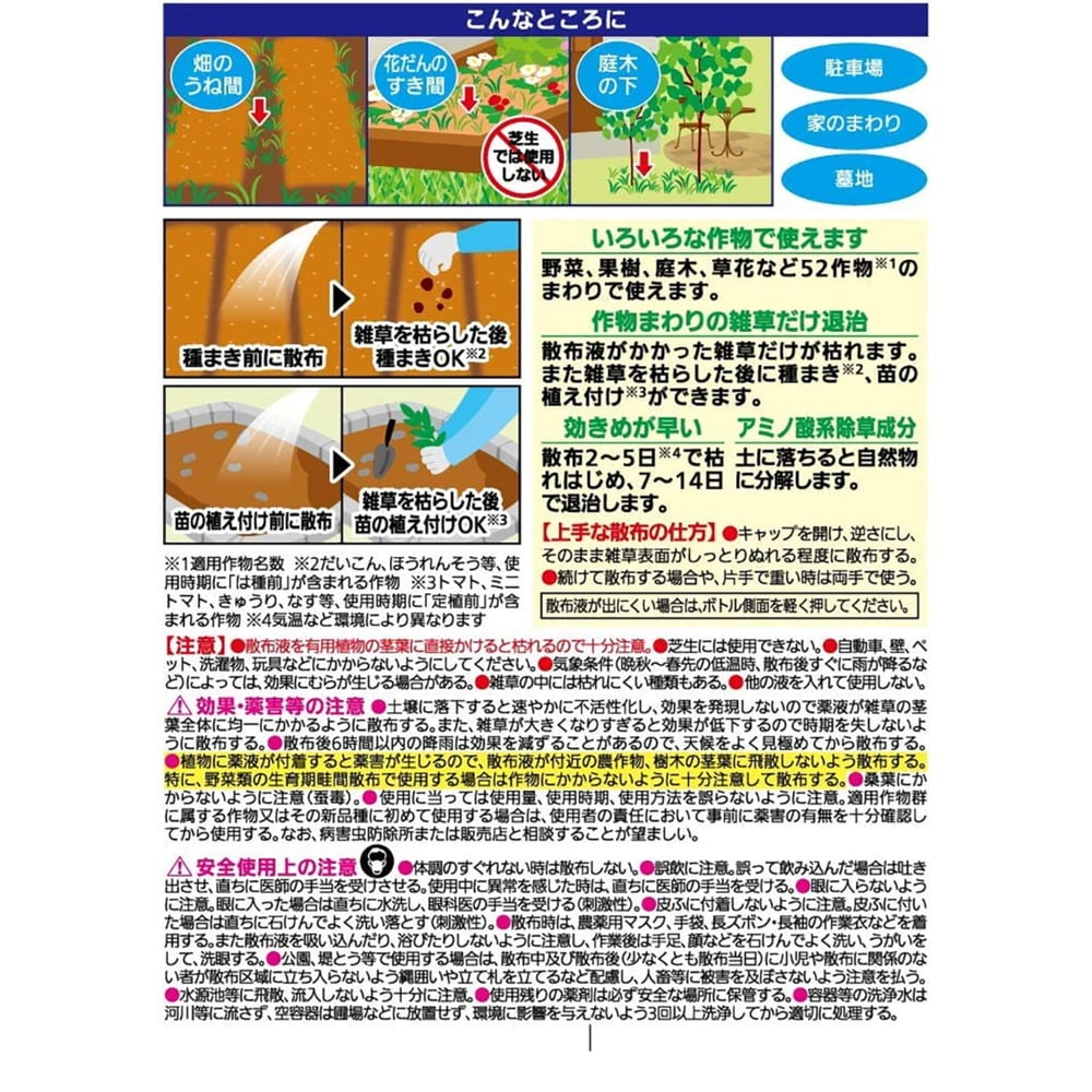 商品説明作物まわりの雑草に使える除草剤 【特徴】 ・畑のうね間で使える!果樹・庭木の下、花壇でも! ・いろいろな作物で使えます 野菜、果樹、庭木、草花などの52作物(適用作物名数)のまわりで使えます ・作物まわりの雑草だけ退治 散布液がかかった雑草だけが枯れます。また雑草を枯らした後に種まき(だいこん、ほうれんそう等、使用時期に「は種前」が含まれる作物)、苗の植え付け(トマト、ミニトマト、きゅうり、なす等、使用時期に「定植前」が含まれる作物)ができます ・効きめが早い 散布後2~5日(気温など環境により異なります)で枯れはじめ、7~14日で退治します ・アミノ酸系除草成分 土に落ちると自然物に分解します