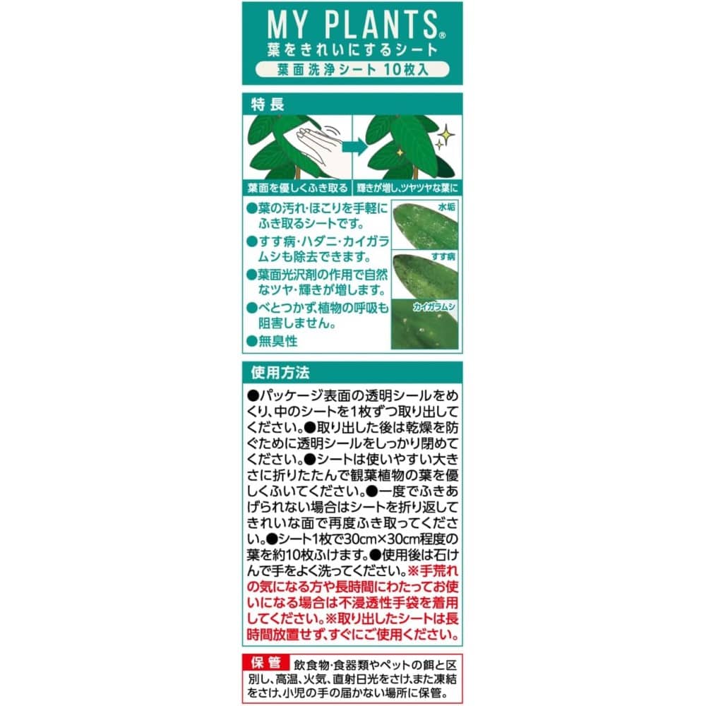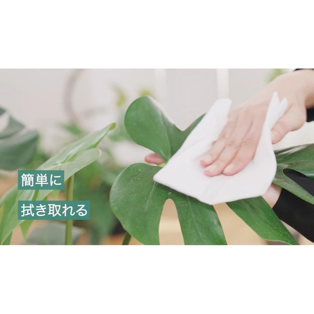 ・葉の汚れ・ほこりを手軽にふき取るシート ・すす病・ハダニ・カイガラムシも除去 ・葉面光沢剤の作用で自然なツヤ・輝きが増します ・葉の汚れ・ほこりを手軽にふき取るシートです。 ・すす病・ハダニ・カイガラムシも除去できます。 ・葉面光沢剤の作用で自然なツヤ・輝きが増します。 ・べたつかず、植物の呼吸も阻害しません。 ・無臭性
