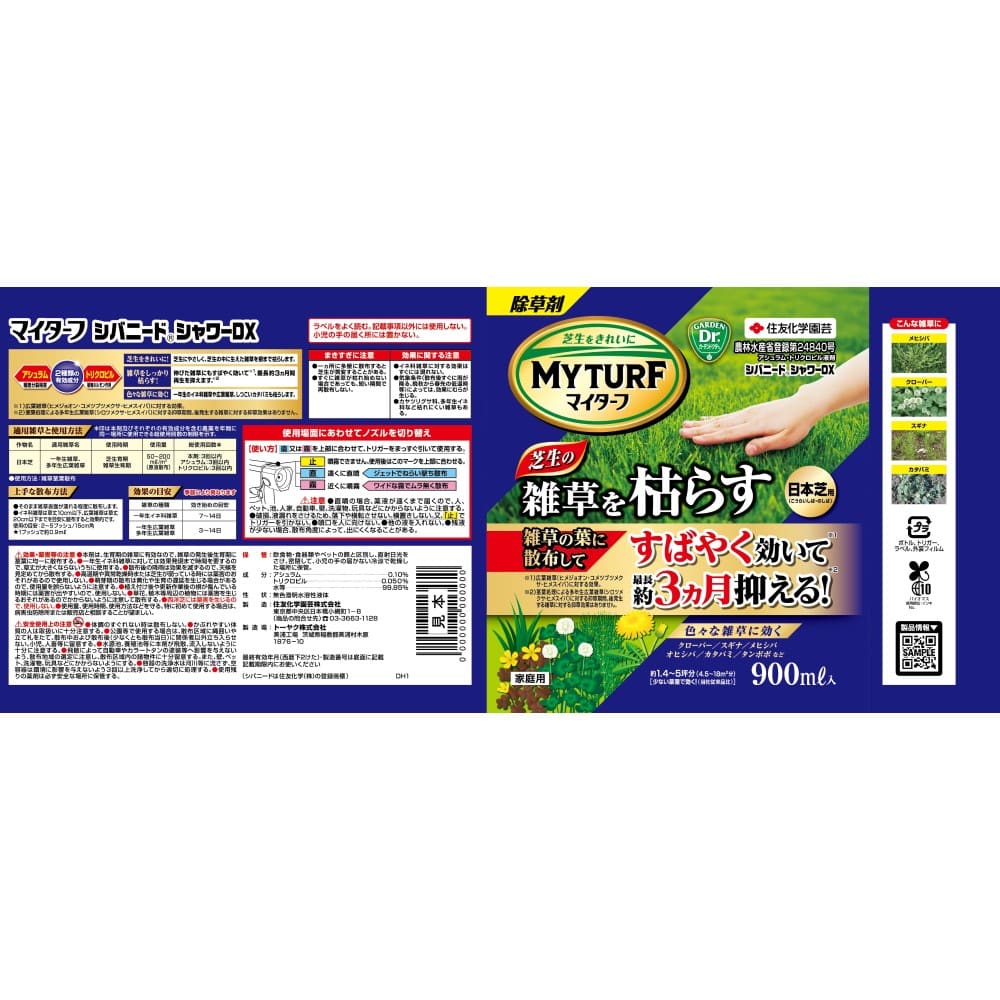 ・長期持続効果(約3ケ月)の芝生用除草シャワー剤 ・一年生のイネ科雑草や広葉雑草、カタバミに効果 ・そのまま散布する芝生用除草シャワー剤 ・芝をきれいに 芝生にやさしく、芝生の中に生えた雑草を根まで枯らします。 ・雑草をしっかり枯らす! 伸びた雑草にもすばやく効いて最長約3カ月間再生を抑えます。 ・色々な雑草に効く! 一年生のイネ科雑草や広葉雑草、しつこいカタバミも枯らします。 (クローバー、スギナ、メヒシバ、オヒシバ、タンポポなど) ・手軽な散粒ボトル(700g)、散布容器・手袋付き(1.4kg) 手を汚さずにそのまま手軽に散布できます。