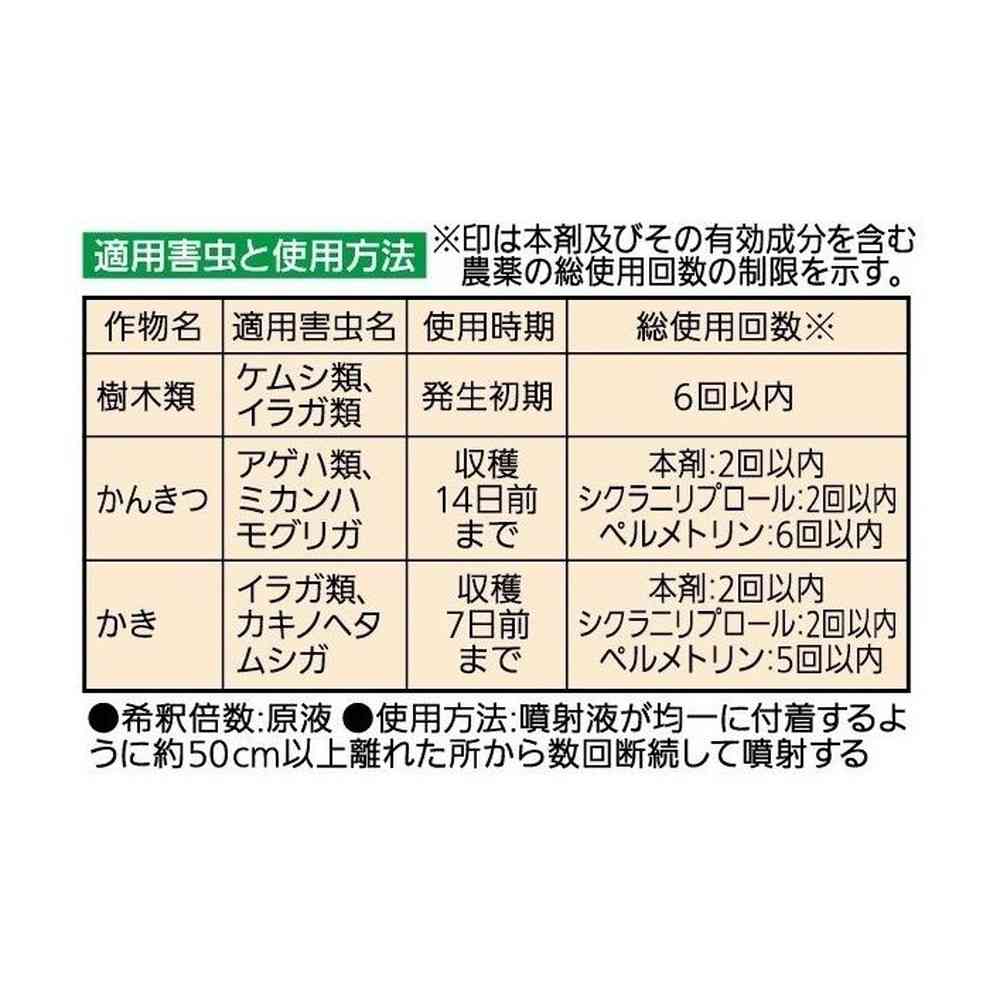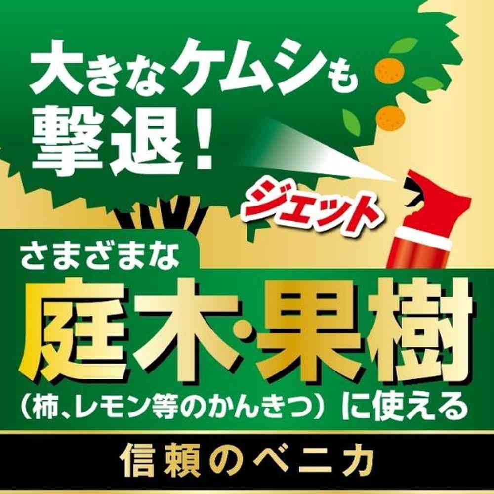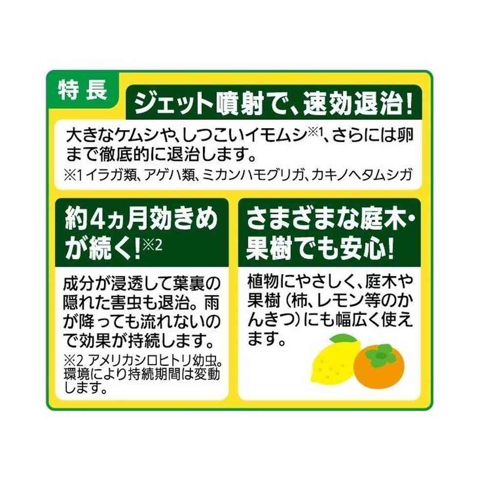 商品説明●ジェット噴射で、速効退治! 大きなケムシや、しつこいイモムシ※1、さらには卵まで徹底的に退治します。 ●約4ヵ月効きめが続く!※2 成分が浸透して葉裏の隠れた害虫も退治。雨が降っても流れないので効果が持続します。 ●さまざまな庭木・果樹でも安心! 植物にやさしく、庭木や果樹(柿、レモン等のかんきつ)にも幅広く使えます。 ※1 イラガ類、アゲハ類、ミカンハモグリガ、カキノヘタムシガ ※2 アメリカシロヒトリ幼虫。環境により持続期間は変動します。