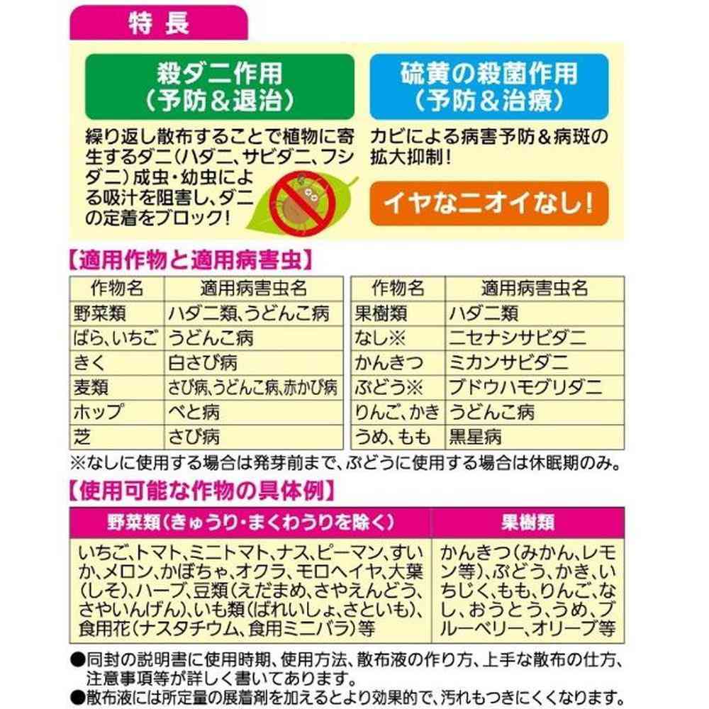 商品説明●ハダニしっかりブロック ●殺ダニ作用(予防&退治) 繰り返し散布することで植物に寄生するダニ(ハダニ、サビダニ、フシダニ)成虫・幼虫による吸汁を阻害し、ダニの定着をブロック! ●硫黄の殺菌作用(予防&治療) 硫黄の殺菌作用でカビによる病害(うどんこ病、黒星病、さび病、赤かび病、白さび病、べと病)を予防。うどんこ病には治療効果が認められ、病斑の拡大を抑制します。 ●イヤなニオイなし!手軽に何回も使える! 天然由来の純粋な硫黄なのでイヤなニオイがなく、植物のダニや病気対策へ回数制限なく使えます。 野菜(きゅうり・まくわうりを除く)・くだもの・果樹・ばらなど幅広い作物へ使用できます。 有機JAS規格(オーガニック栽培)で使用可能です。