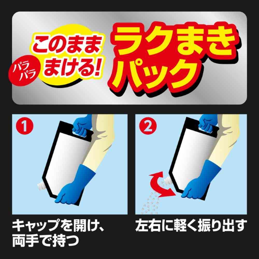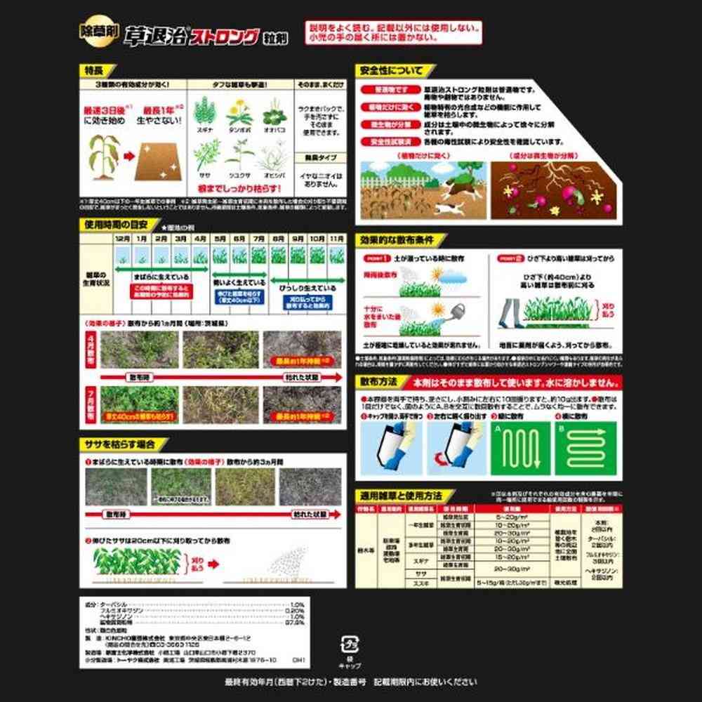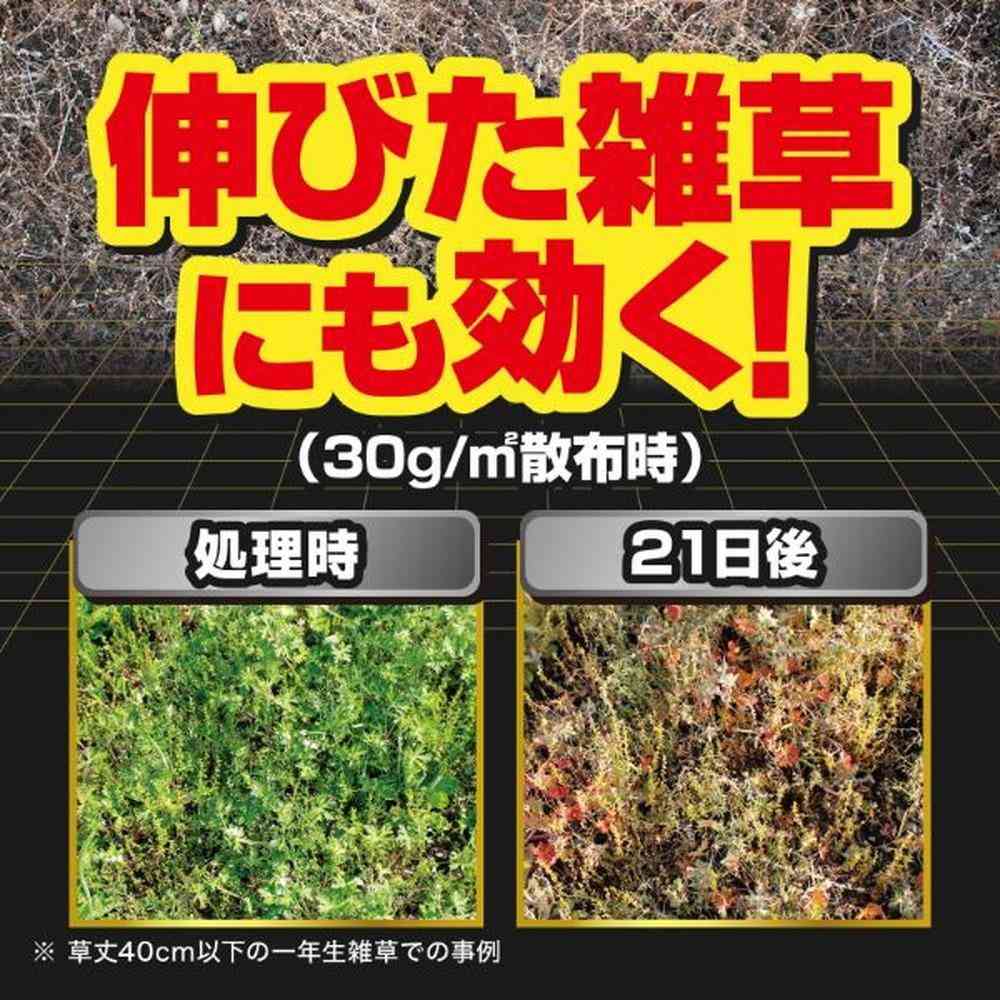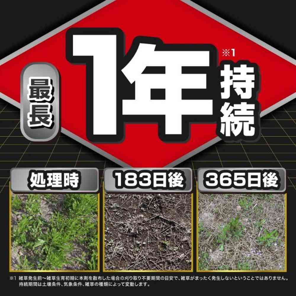 商品説明●3種類の有効成分が効く! 最速3日後※1で効き始め、最長1年※2生やさない。 ●タフな雑草も撃退! スギナ・タンポポ・オオバコ・ツユクサ・ササ・オヒシバ 根までしっかり枯らす! ●そのまままくだけ! ●無臭タイプ イヤなニオイはありません。 ※1 雑草発生前~雑草生育初期に本剤を散布した場合の刈り取り不要期間の目安で、雑草がまったく発生しないということではありません。持続期間は土壌条件、気象条件、草種によって差が生じます。 ※2 草丈40cm以下の一年生雑草での事例