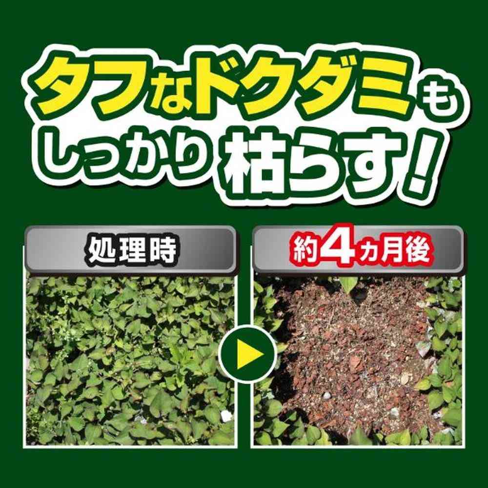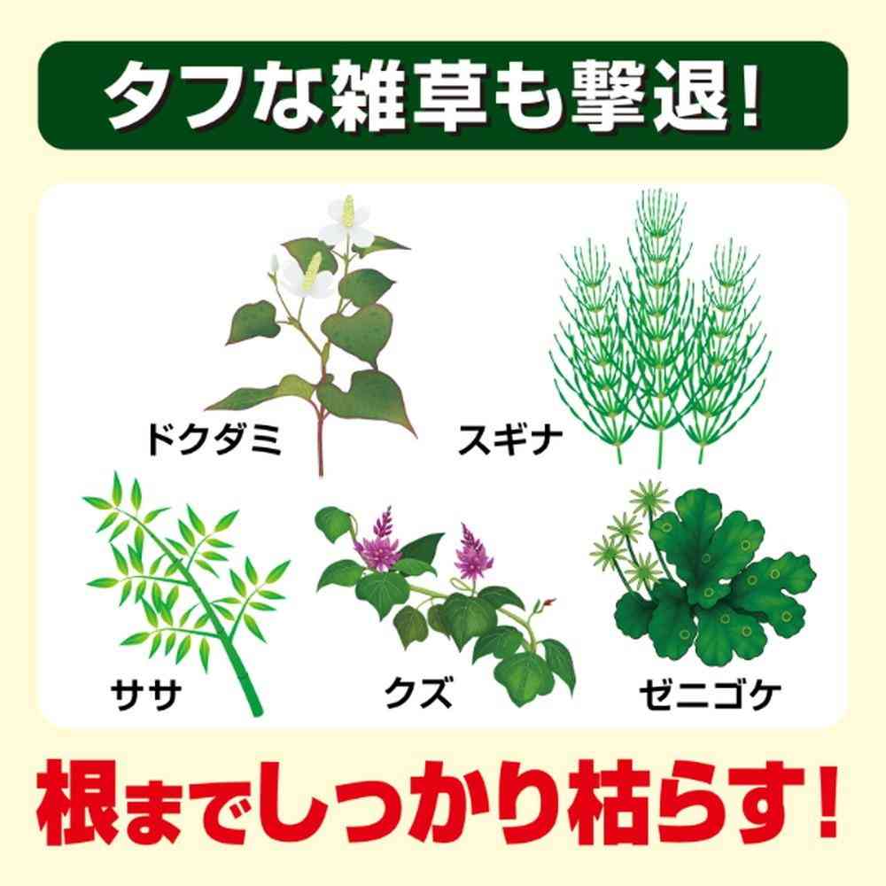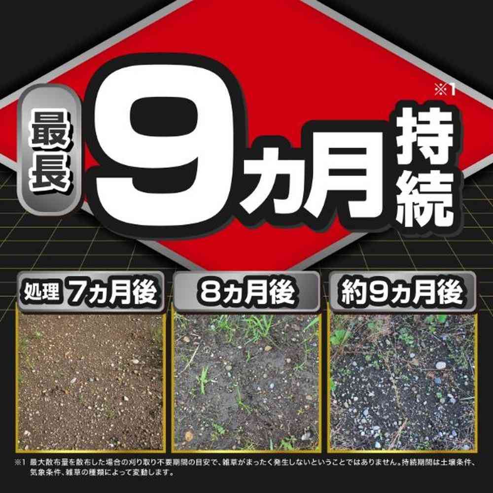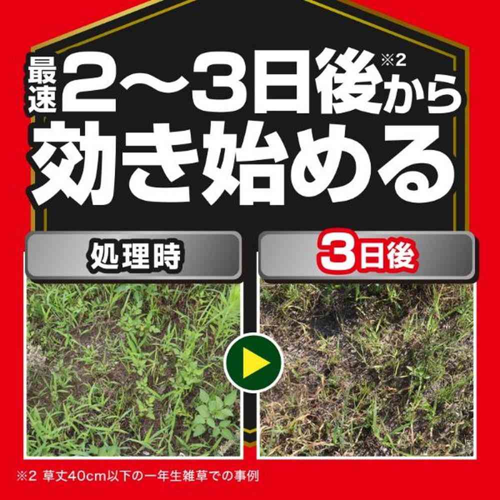 商品説明●速効&持続 除草効果は最速翌日※1から効き始め、最長11ヵ月生やしません。 ●タフな雑草も撃退 ドクダミ・スギナ・ササ・ヤブガラシ・コケの根まで枯らします。 ●かんたんまくだけ! ●無臭性 イヤなニオイなし ※1 最大散布量を散布した場合の刈り取り不要最長期間の目安で、雑草がまったく発生しないということではありません。持続期間は土壌条件、気象条件によって変動します。 ※2 草丈50cm以下の一年生雑草での事例
