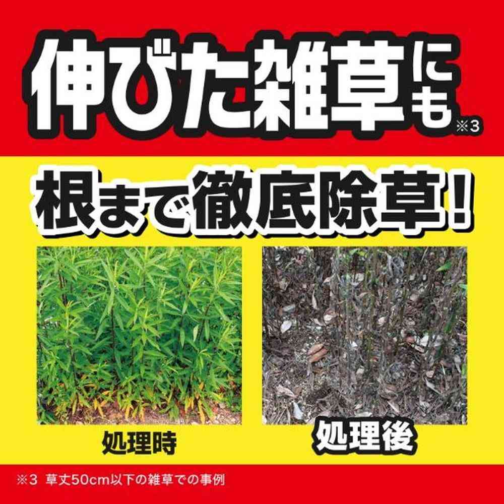 商品説明●速効&持続 除草効果は最速翌日※1から効き始め、最長11ヵ月生やしません。 ●タフな雑草も撃退 ドクダミ・スギナ・ササ・ヤブガラシ・コケの根まで枯らします。 ●かんたんまくだけ! ●無臭性 イヤなニオイなし ※1 最大散布量を散布した場合の刈り取り不要最長期間の目安で、雑草がまったく発生しないということではありません。持続期間は土壌条件、気象条件によって変動します。 ※2 草丈50cm以下の一年生雑草での事例