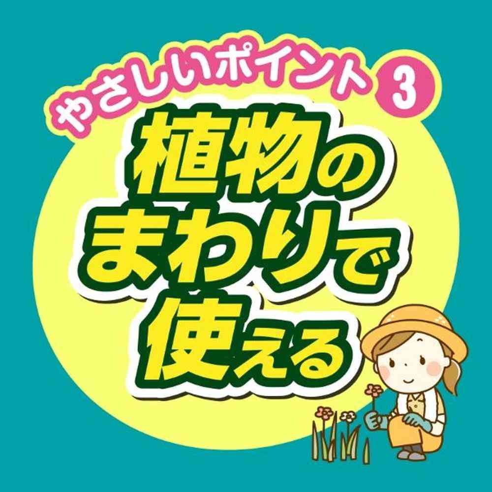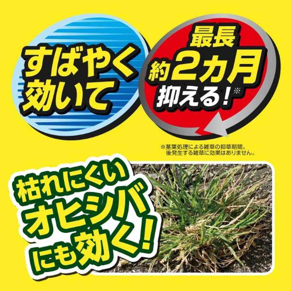 商品説明●家まわりの困った雑草をしっかり枯らす! お困りのドクダミ・スギナ・タンポポ・カタバミや、問題雑草のオヒシバ等もしっかり枯らします。 ●速く・しっかり効く! 最速2~5日で効きはじめ、しっかり枯らして最長2ヵ月間雑草を抑えます。※1 ●植物の周囲で使える! 草花・野菜※2・庭木の周囲で使え、かけた雑草だけを枯らします。 ※1:茎葉処理による雑草の抑草期間。後発生する雑草に効果はありません。※2:適用表参照