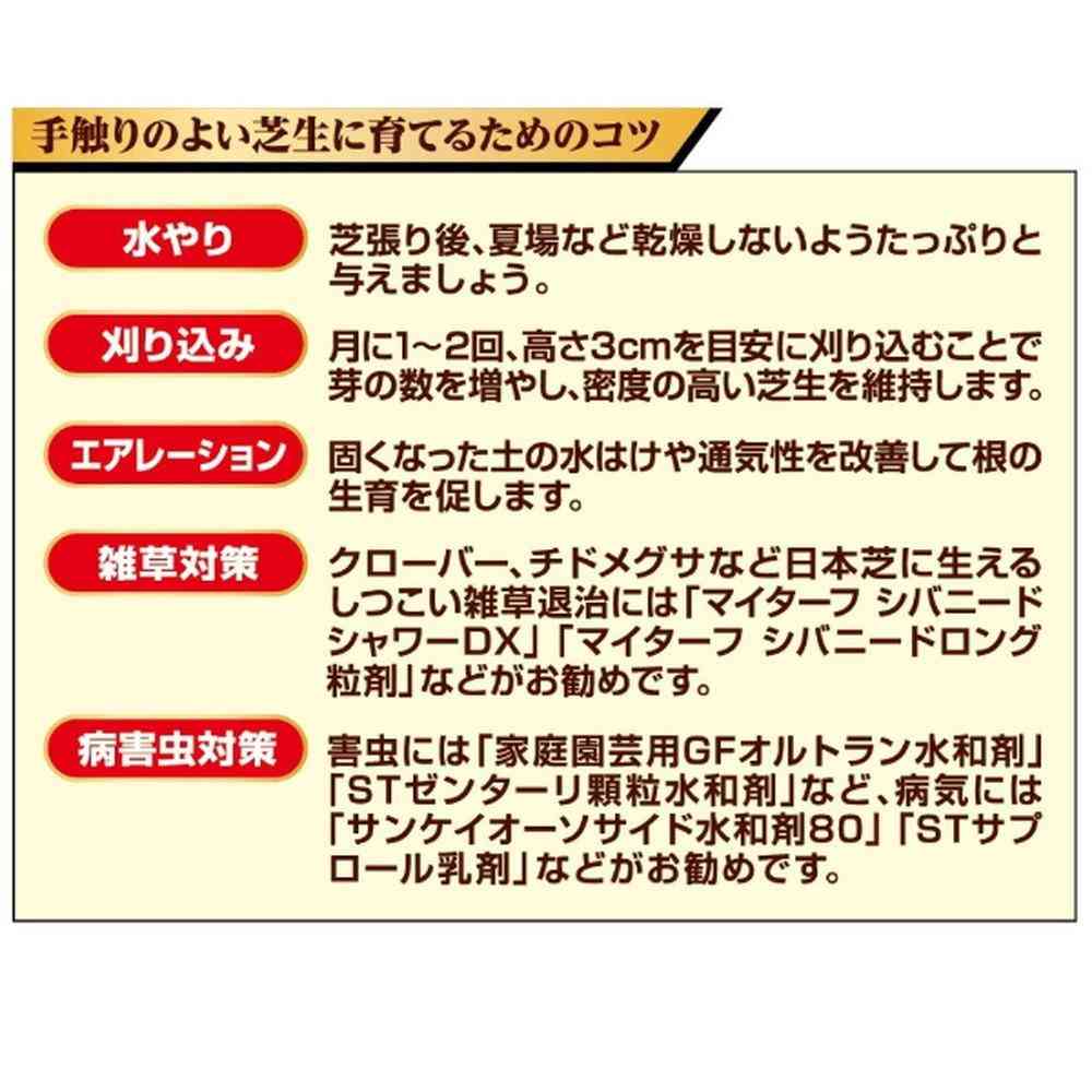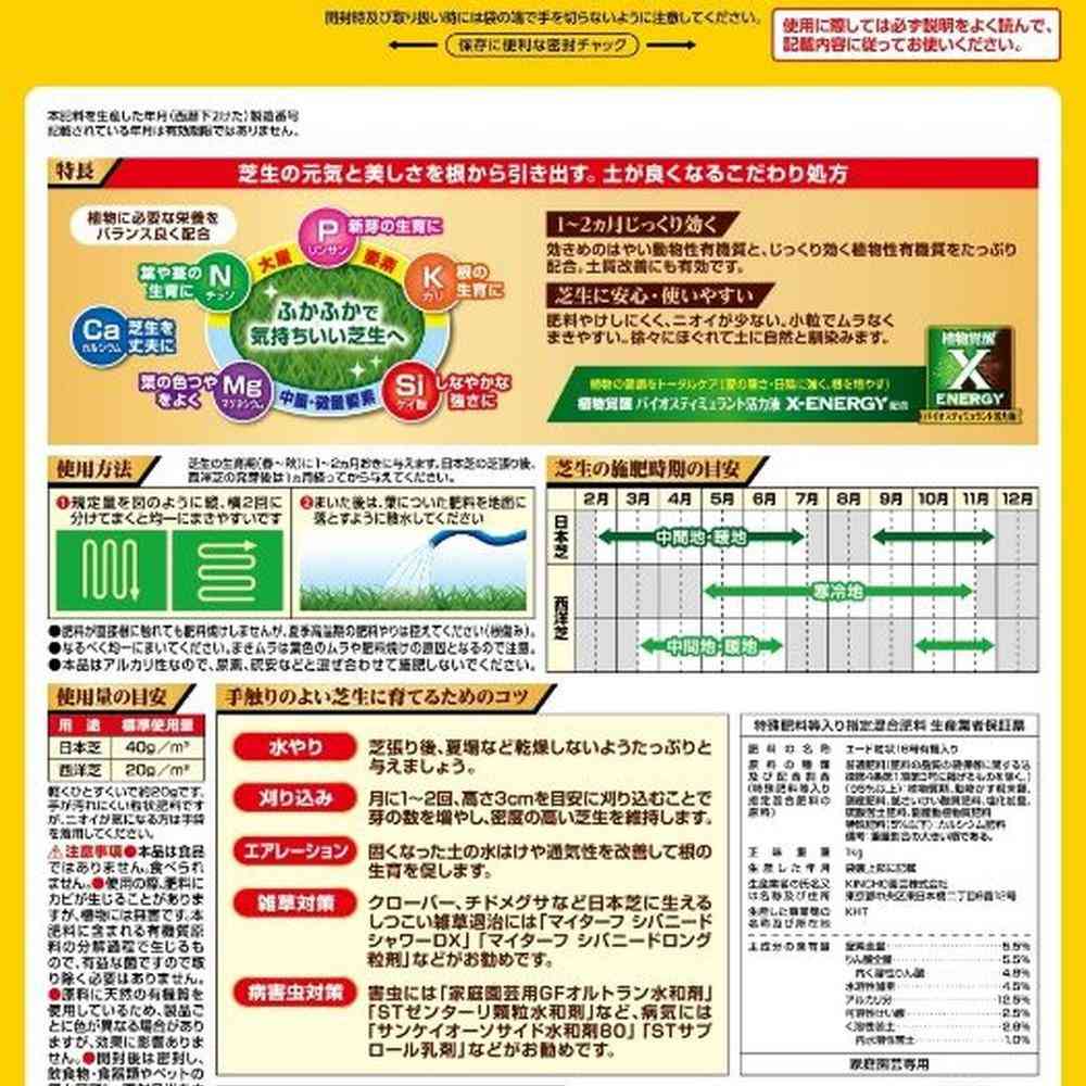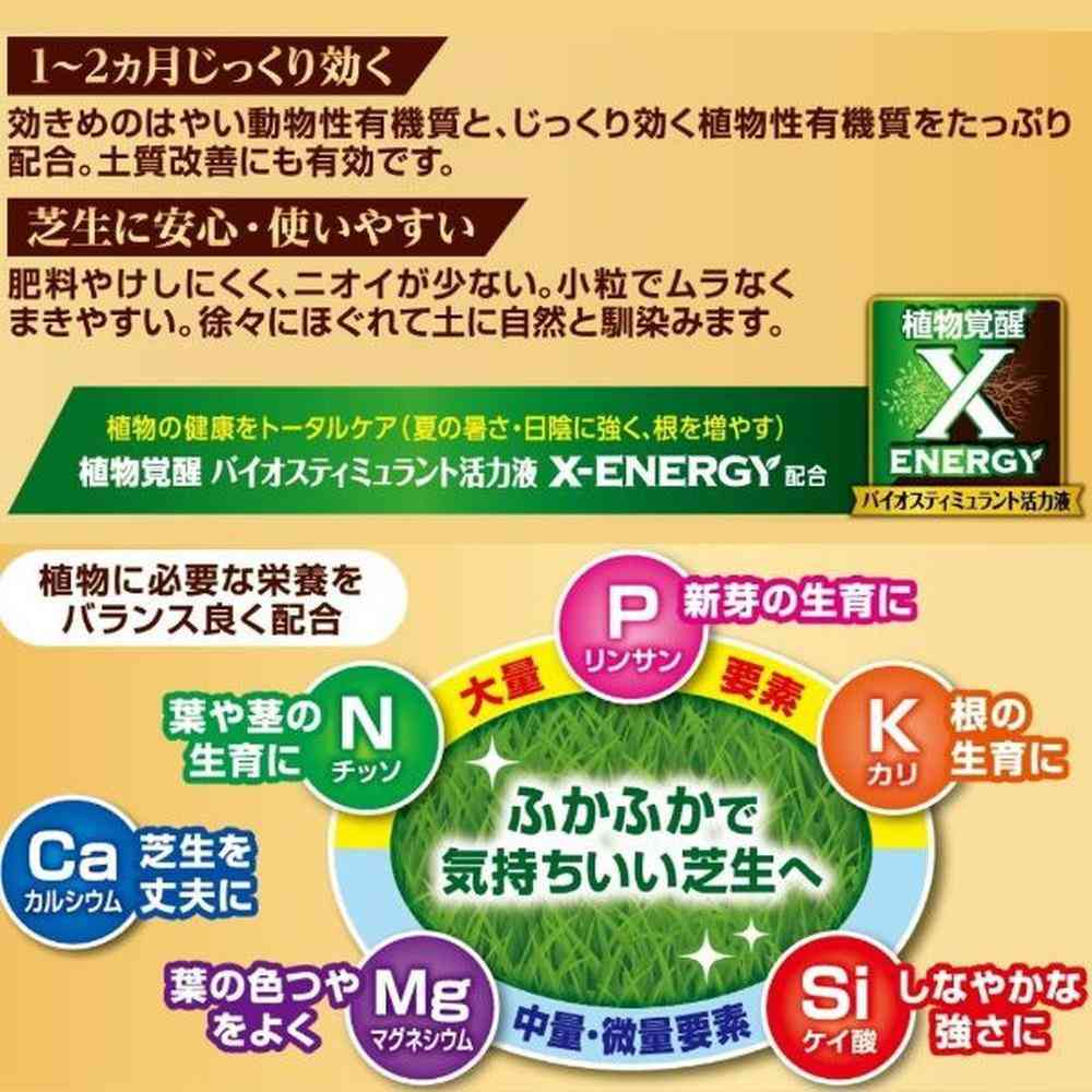 ●芝生の元気と美しさを根から引き出す 土が良くなるこだわり処方 ●触り心地のよい健全で美しい芝生に育てます。 ●植物に必要な栄養をバランス良く配合。 (Nチッソ 葉や茎の生育に Pリンサン 新芽の生育に Kカリ 根の生育に Mg 葉の色つやをよく Caカルシウム 芝生を丈夫に Siケイ素 しなやかな強さに) ●1~2ヵ月じっくり効く 効きめのはやい動物性有機質と、じっくり効く植物性有機質をたっぷり配合。土質改善にも有効です。 ●芝生に安心・使いやすい 肥料やけしにくく、ニオイが少ない。小粒でムラなく撒きやすい。徐々にほぐれて土に自然と馴染みます。 ※施肥後、土壌に白いカビ(菌糸)があらわれることがありますが、善玉菌が活性化している証拠で植物に悪影響はありません。