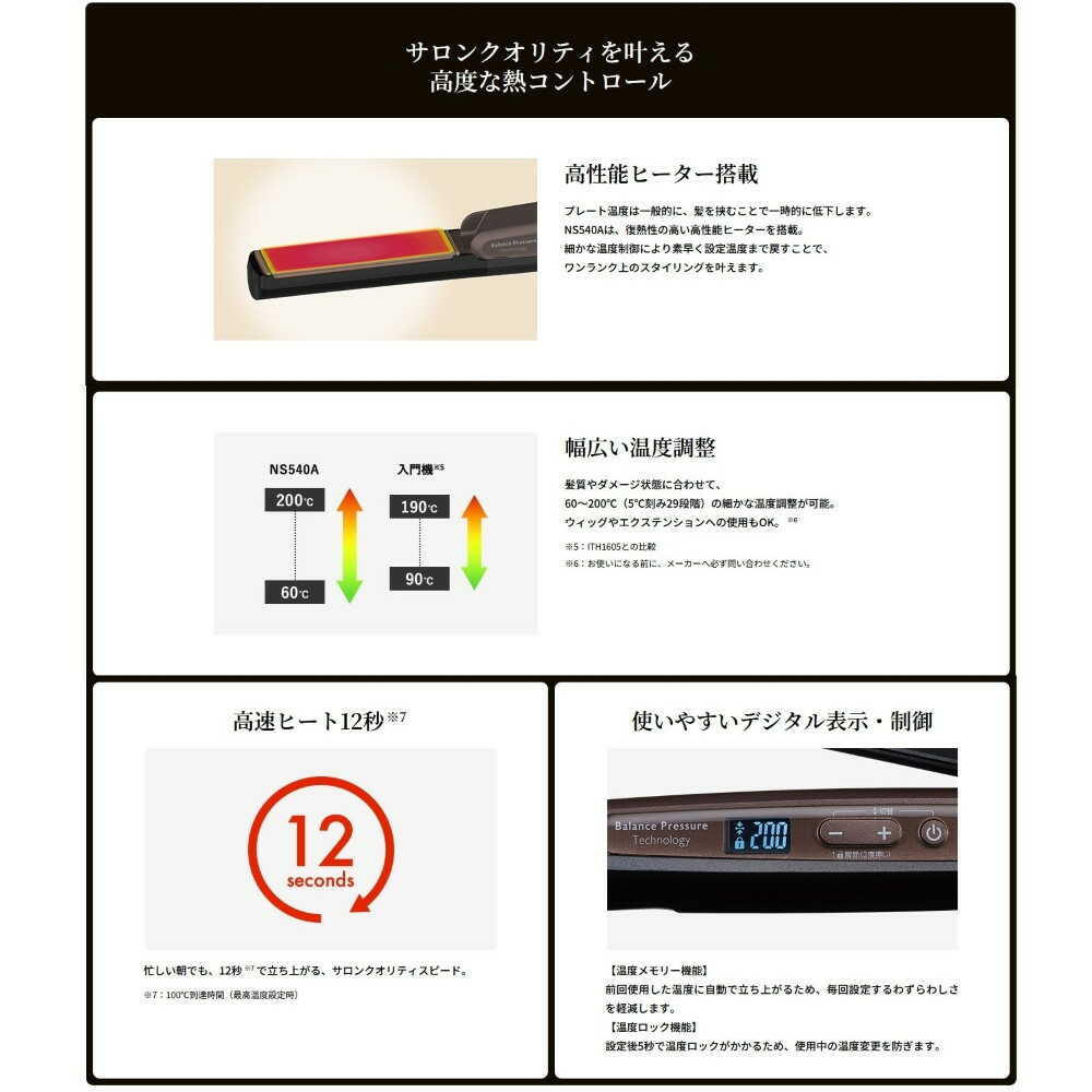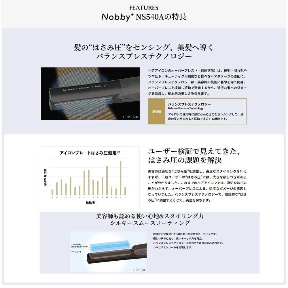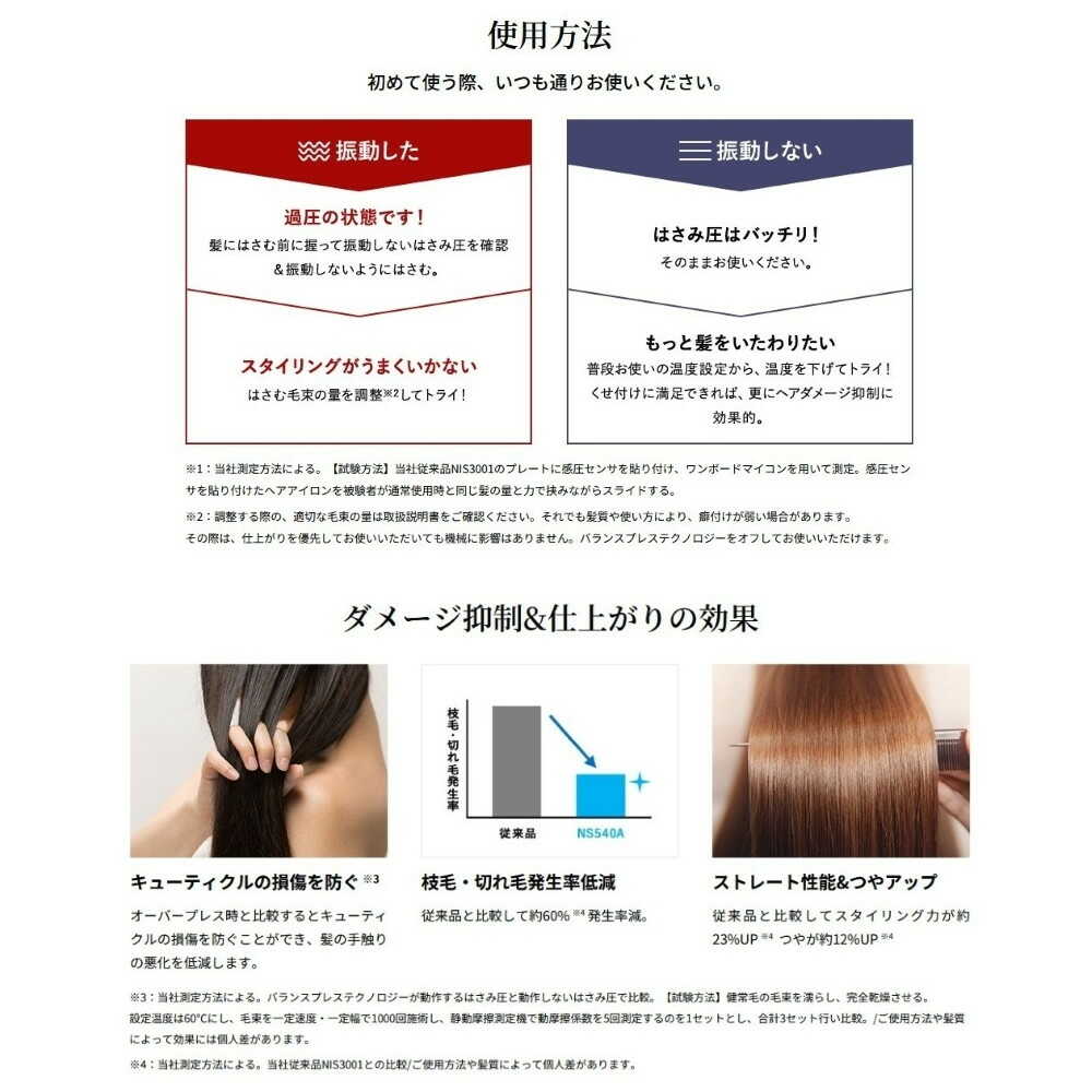 過圧防止センシングでやさしく髪を挟んで、美髪へ導く オーバープレス(過圧状態)は、枝毛・切れ毛やツヤ低下、キューティクル損傷など様々なヘアダメージの原因に。 髪質や仕上がりに合わせて「はさみ圧」を調整する美容師のテクニックから着想。 スタイリングの仕上がりだけでなく、過圧防止でダメージを低減しながら美しさを保つ。 バランスプレステクノロジー※で、オーバープレスを検知し振動でお知らせ、握り方を調整しながらダメージレスに。 ※バランスプレステクノロジー:BalancePressureTechnology/アイロンの使用中に、髪に過度な圧力が加わると検知して、振動で通知する機能 ●忙しい朝でも約12秒で立ち上がる、サロンクオリティスピード ●両面フロートプレート構造で徹底ストレート&毛先カール ●髪の流れに沿ってプレートが傾き髪にしっかり密着、美しいストレート&毛先アレンジが一本で ●幅広い温度調節でウィッグやエクステンションの使用OK、60~200度の5度刻み29段階の温度調節で仕上がりや髪の傷みに合わせ細やかに設定が可能 ●お好みの角度に調節できるアジャスタブルロックリング