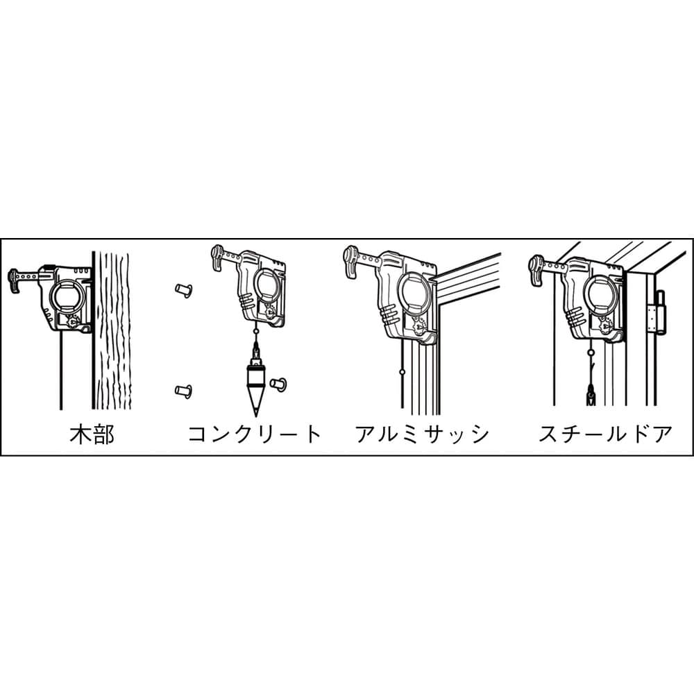 ●自動静止構造で素早く止まる下げ振り「ピーキャッチクイックブラ400」付です。●自動巻取式です。●木部、鉄部、アルミサッシ、コンクリートに取付可能です。●超強力磁石を採用しています(磁束密度130mT)。●ケースはABS樹脂とエラストマー樹脂の一体成型で滑りにくいです。●針の飛び出しを防止する針ロック機構を搭載しています。●見やすい蛍光黄色糸を採用しています。●色:赤●糸長さ(m):4.5●適合下げ振り重量(g):100~1000 質量658g
