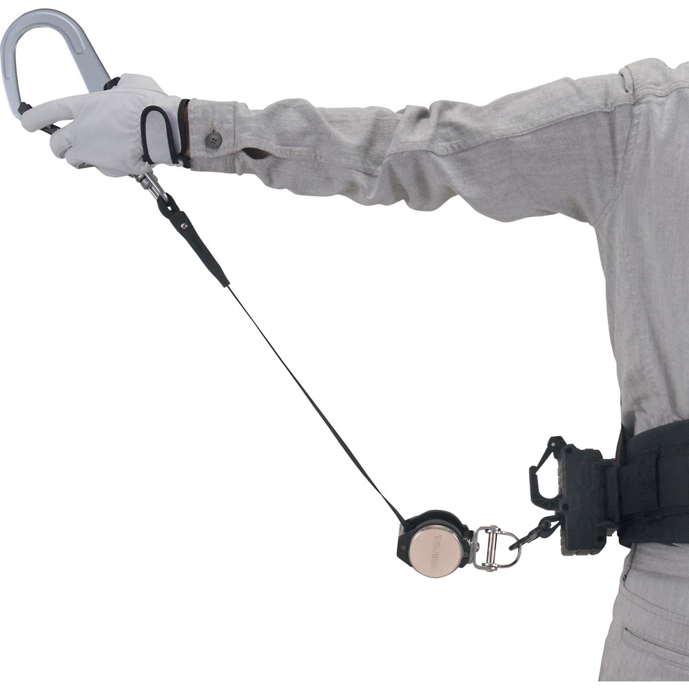 ●装着スペース10cmの省スペース縦型ショックアブソーバを採用しています。●落下距離を最短に抑えるロック装置付小型巻取式を採用しています。●フックは硬質焼入ゲート付スチールフックです。●ランヤードが絡みにくい寄り戻し付です。●色:黒●フック口開き(mm)構造物側:55●フックタイプ:L2(高耐久スチール/より戻し)●最大使用可能質量(kg):100●長さ(mm):1500●フック:L2(高耐久スチール/より戻し)●ランヤード寸法幅(mm):16.5●ランヤード寸法長さ(mm):1500●種類:胴ベルト型用●種類:胴ベルト型用●ショックアブソーバ種別:第一種(4kN)●ロック装置:有●最大自由落下距離:1.8m●落下距離:3.1m 質量1280g