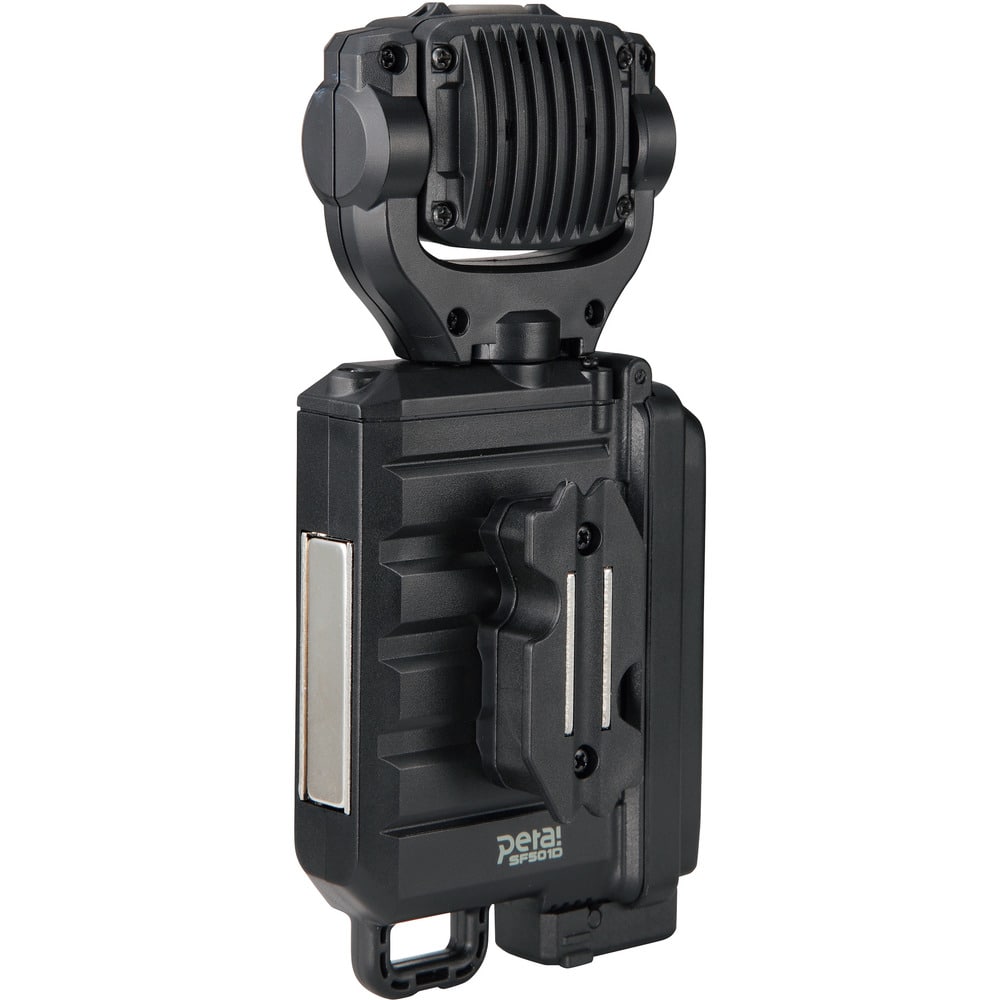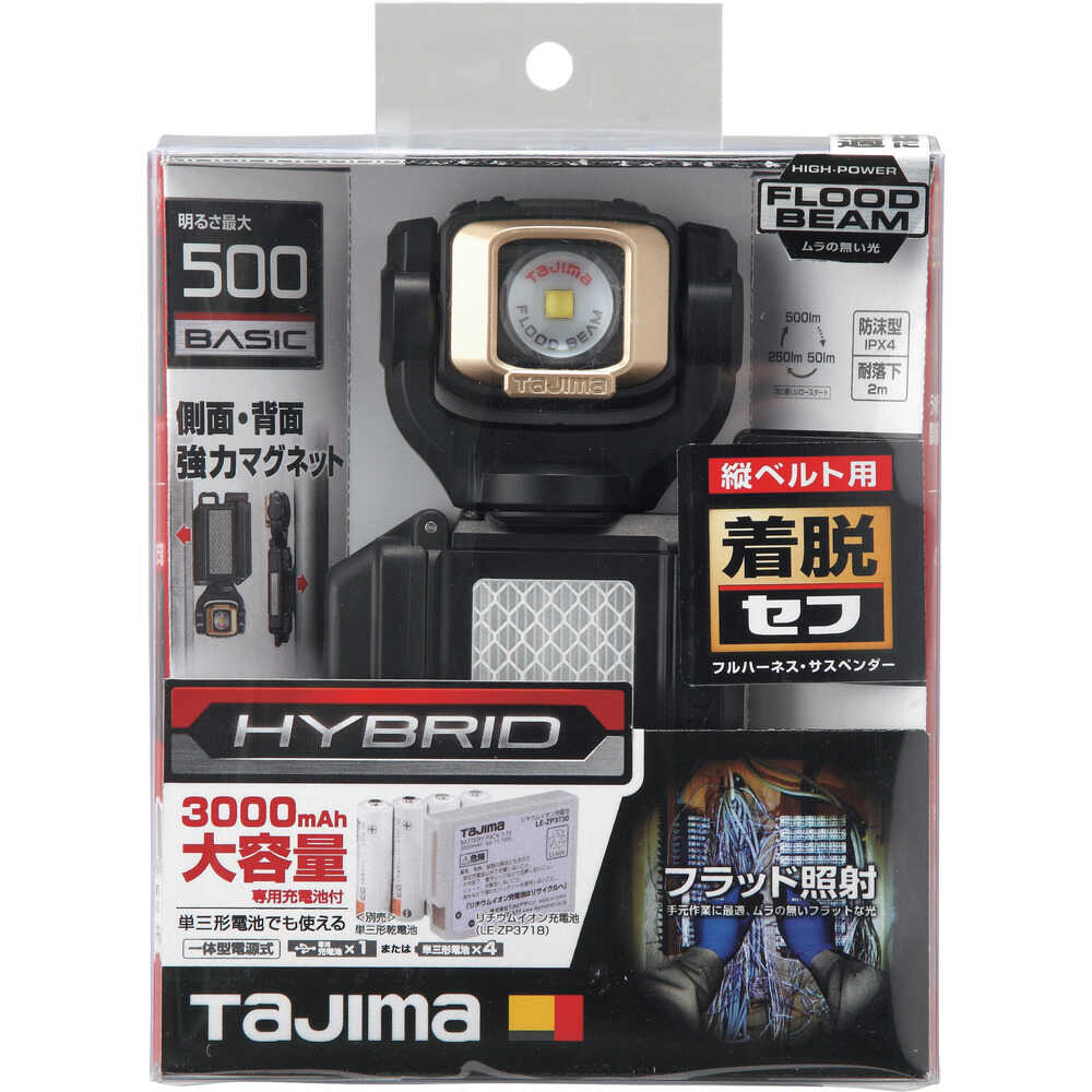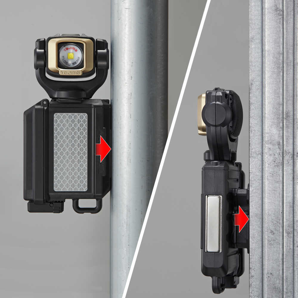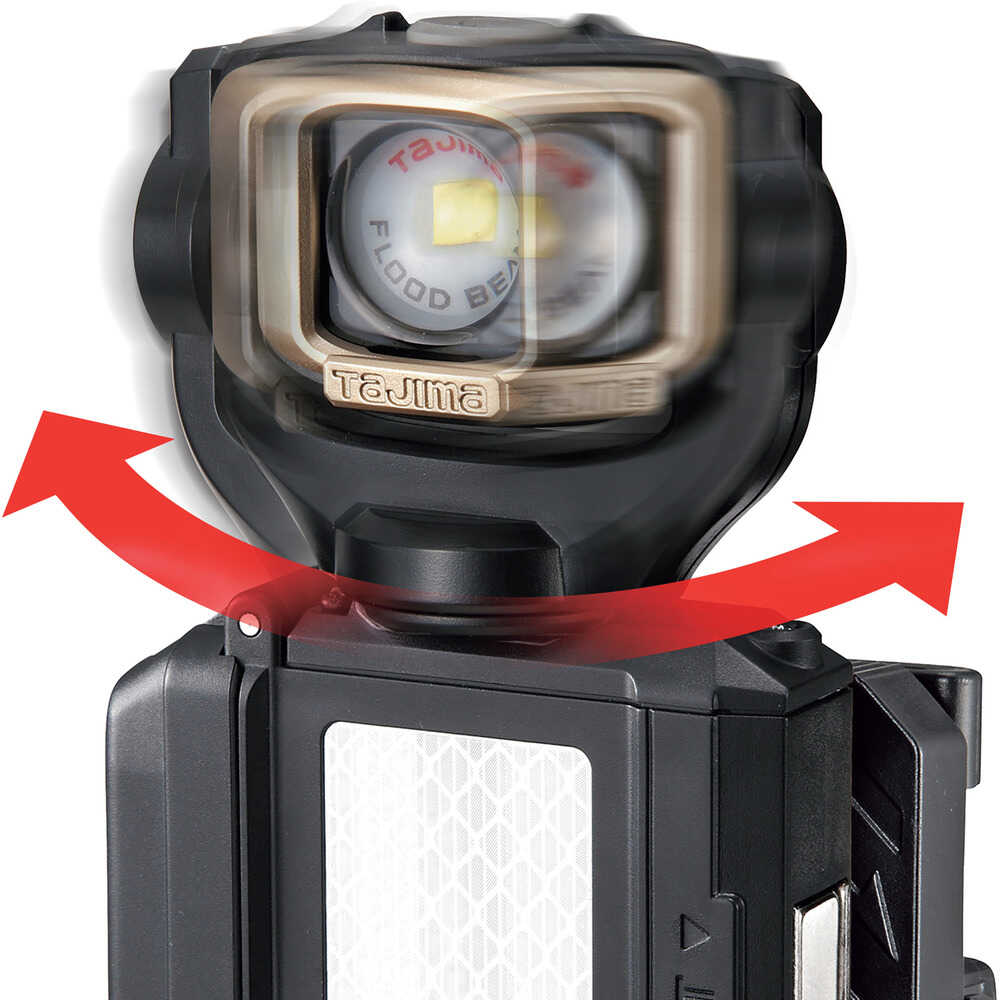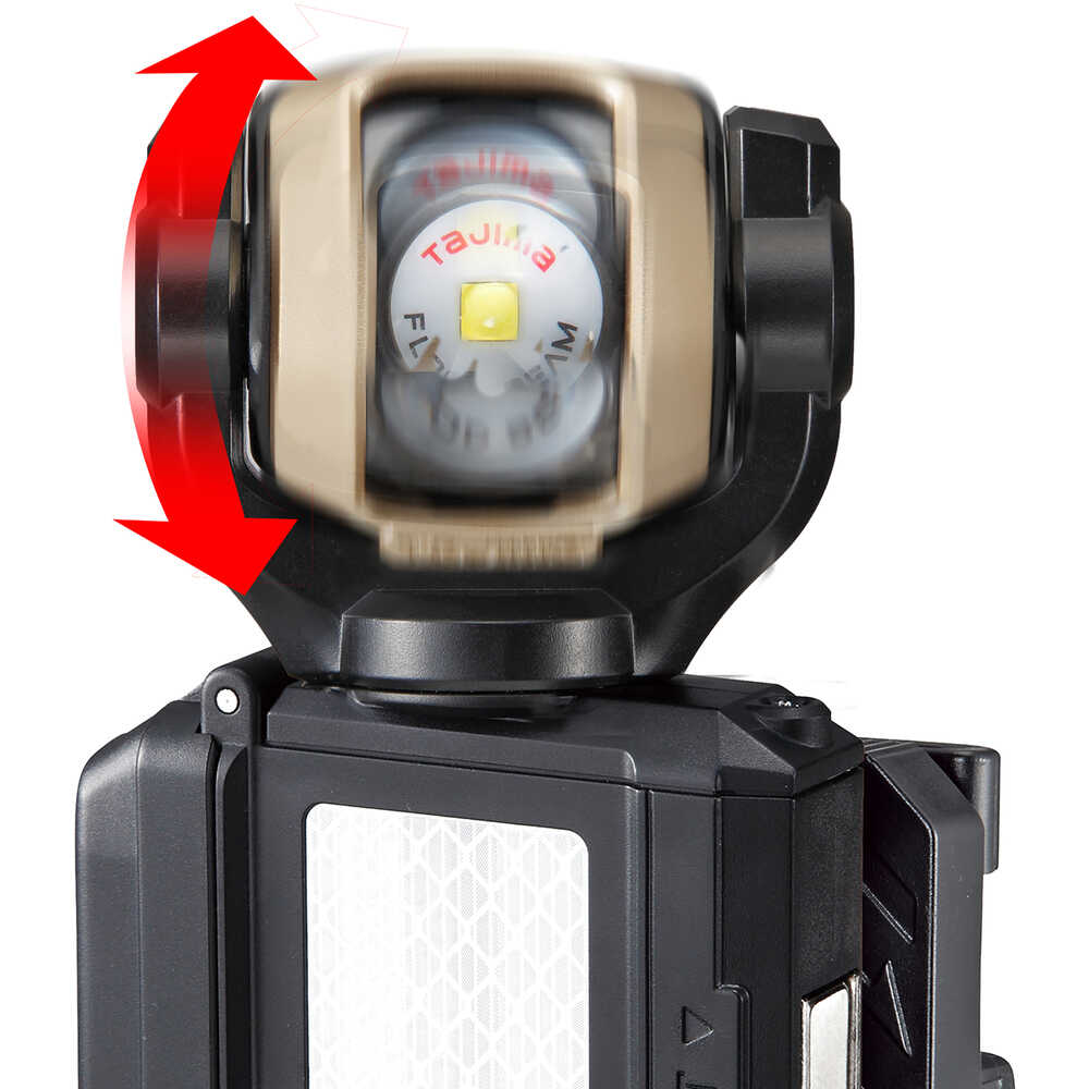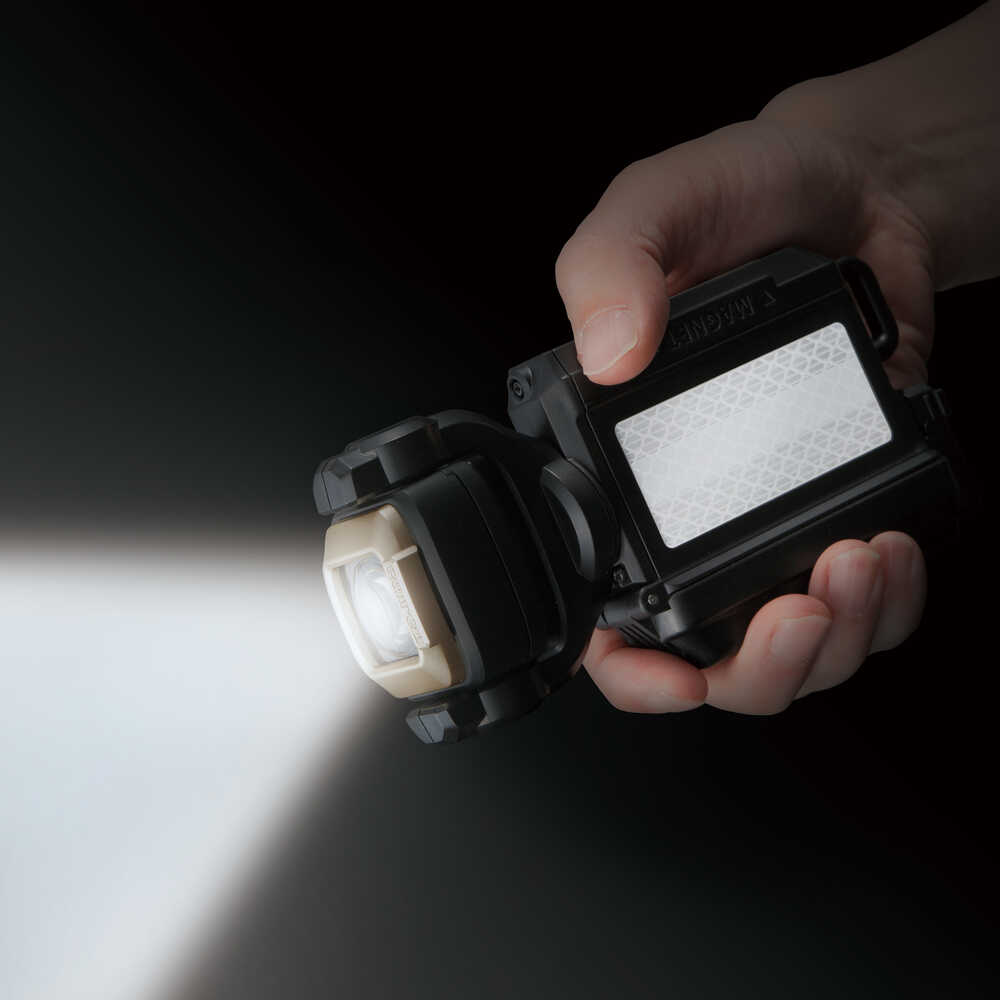 ●専用充電池または単三形乾電池どちらも選べるハイブリッド式です。●縦ベルト用セフに、上下どちらの向きでも取付けが可能です。●角度調整ヘッドで上下左右、自由自在です。●単管パイプ・鉄材に固定できる、強力ネジオ磁石付です。●リュック等に装着してアウトドア用品としても最適です。●ライトの未点灯時や夜間に安全を確保する反射シート付です。●目と電池にやさしいロースタートプッシュスイッチを採用しています。●フリッカー対策済・電池残量警告付です。●最大500lm、250lm、50lm、明るさが選べる3モードです。●明るさ(lm):500●色:黒金●幅(mm):73●奥行(mm):40●高さ(mm):150●保護等級:IPX4●センサー:なし●電池容量(mAh):3000●電源:専用充電池、または単3アルカリ乾電池×4本(別売)●最大点灯時間:50lm:21h(モード1)、250lm:12h(モード2)、500lm:8h(モード3)(明るさが初期値の10%を切るまでの時間)●保護等級:IPX4●落下強度:2m(ANSI/NEMA FL1-2009) 質量135g