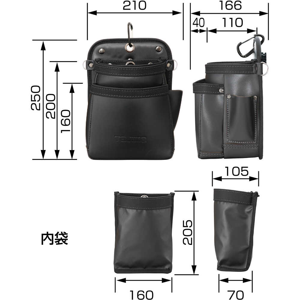 ●※セフホルダーは別売となります。●ご利用にはセフホルダーが必要になります。●2つのセフで着脱性アップした「セフツインフック」です。●堅牢でしなやかな上質レザーを厳選します。●摩耗/変形に強いパイピング構造です。●幅広い職人さんに適したスタンダード形状の腰袋です。●腰袋は装着したまま、外してゴミを捨てられる着脱が便利な内袋付です。●セフ取付収納物総重量:3.0kg以下です。●ちょい使いができるフック掛けホールとカラビナ付です。●腰周りの組み換えが簡単です。●色:黒●形状:腰袋段中●幅(mm):210●奥行(mm):166●高さ(mm):250●ベルト通し幅(mm):50●製品重量(g):580●包装形式:クリアケース●包装寸法タテ(mm):305●包装寸法ヨコ(mm):214●包装寸法オクユキ(mm):92●梱包単位:24個(4個入×3)●セフ取付収納物総重量:3.0kg以下●セフ:別売 質量580g