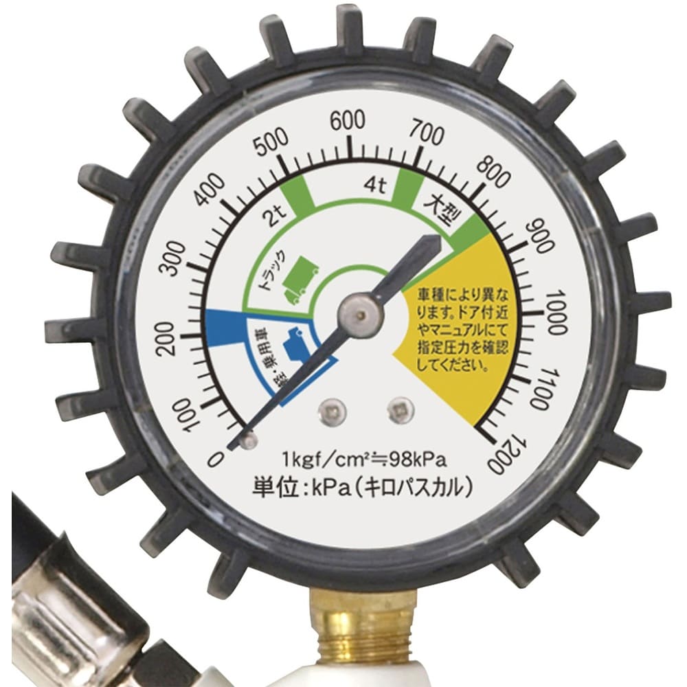 ●見やすい目安イラスト表示付です。●残留エア抜き用ボタン付きです。●ダブルタイヤに対応しています。●測定範囲(kPa):0-1200●最高使用圧力(MPa):1.2●適合流体:空気●最高使用圧力:1.2MPa●目量:20kPa●測定精度:±30kPa●チャック:米式バルブ●ホースサイズ(mm): 内径6.5x外径12x長さ330 質量360.000g
