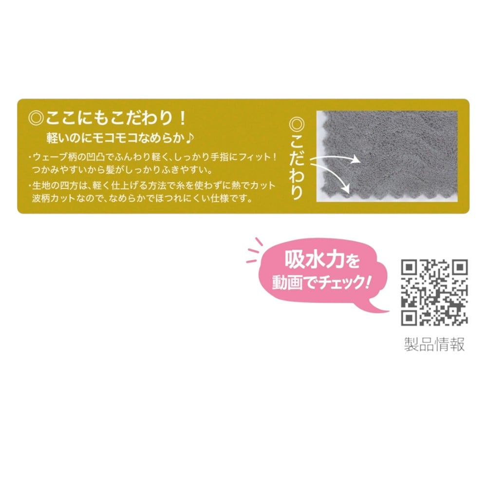 もこもこ吸水マイクロファイバーでマルシェろう!美の女神が忙しい毎日のあなたの味方になって美人髪を育てるお手伝いをします。ドライヤー時間を短縮!「整う」髪へ。ポイント1:特殊な繊維で吸水力UP。超極細繊維で洗髪後の水分をすばやく吸水!ポイント2:抗菌・防臭加工。毎日使うものだから、いつも清潔!ポイント3:やさしい手触り。カットパイル仕上げで髪に優しくお肌あたりもなめらか。ウェーブ柄の凹凸でふんわり軽く、しっかり手指にフィット!つかみやすいから髪がしっかりふきやすい。生地の四方は、軽く仕上げる方法で糸を使わずに熱でカット。波柄カットなので、なめらかえほつれにくい仕様です。