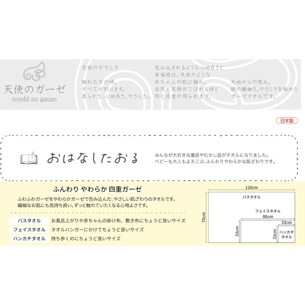 究極のやさしさ。触れたその時、すべてが判ります。柔らかさ、心地良さ、やさしさ。 包み込まれるような心地良さと幸福感は、天使のような赤ちゃんの肌に触れ、自然と笑顔がこぼれる時と同じ感覚が得られます。 天地からの恵み、綿の繊細さ、やさしさを極めたガーゼタオルです。 みんなが大好きな童話やむかし話がタオルになりました。 ベビーも大人もよろこぶ、ふんわりやわらかな肌ざわりです。ふわふわガーゼをやわらかガーゼで包み込んだ、やさしい肌ざわりのタオルです。 繊細なお肌にも気持ち良い、ずっと触れていたくなる心地よさです。