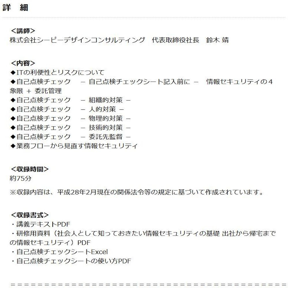 DVD 中小規模事業者用自己点検チェックシートで分かるここから始める情報セキュリティ V58 講義映像とテキスト(PDF)をセット! 本DVDは、これからスタートする中小規模事業者でも安心して、自己点検チェックシート(Excel)を使って、自社の情報セキュリティ対策が点検でき、何が現状足りていないか、必要な対策は何かを正確に把握して、最低限の組織的対策・人的対策・物理的対策・技術的対策・委託先監督の安全管理措置を解説したDVDです。