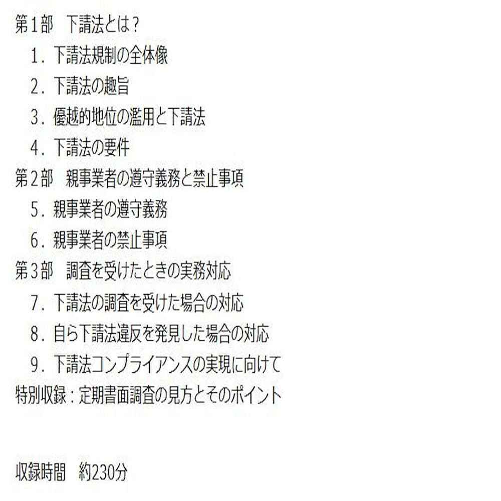 DVD 知らないでは済まされない下請法の基礎と実務対応 V75 セミナー形式でわかりやすく解説! 本DVDでは、下請法の基礎的な概要説明から、下請法遵守の基本となる親事業者の4つの義務と11の禁止事項について、事例を交えわかりやすく解説し、万一立ち入り検査の連絡が来たときに、実際の件はどういう流れになるのか、またどのような準備をしたらいいのか、そして検査官はどういうところを見ているのか等、事例を交え解説したものです。また、毎年の定期書面調査のポイントについて解説したシートも合わせて収録しています。