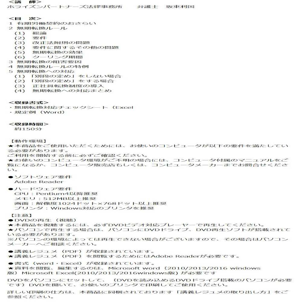 DVD 無期転換制度による法的リスク対応と就業規則等の整備のポイント V76 分かりやすく解説! 本DVDでは、労働契約法による無期転換に対する準備が出来ていない企業が知っておかなければならない知識はもちろんのこと、準備が済んでいる企業においても無期転換への対応の最終確認ができるように、無期転換の対応で留意すべき点や就業規則等のチェックすべき点を細部にわたり解説しています。