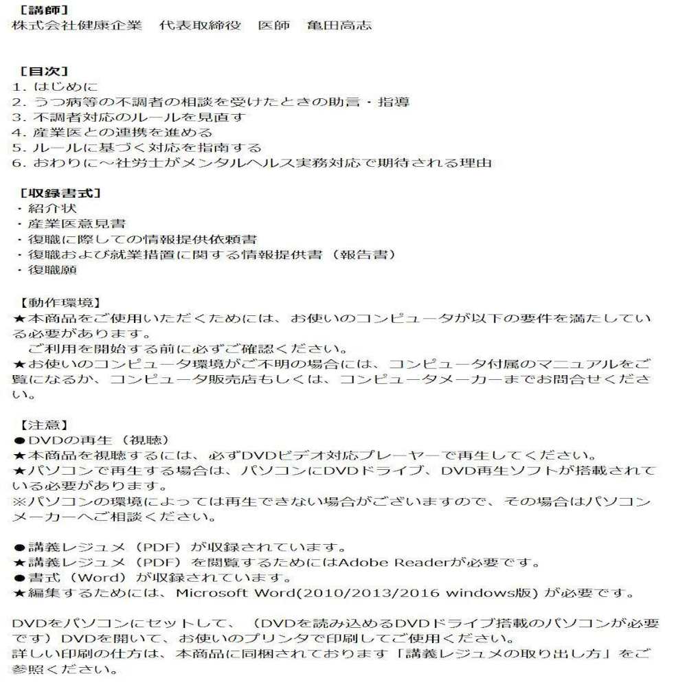DVD 社労士のための産業医と連携したメンタルヘルス不調者への実務対応 V81 分かりやすく解説! 産業医を活用したメンタルヘルス不調者対応のルールがわかる!メンタルヘルス不調者への対応の仕方と、産業医との連携におけるポイントを医師が解説。また、企業にどのような指導・対応をすればよいのか、そして産業医との連携におけるポイントや産業医の選び方を解説しています。また、産業医とやりとりするうえで必要となる書式も合わせて収録しています。