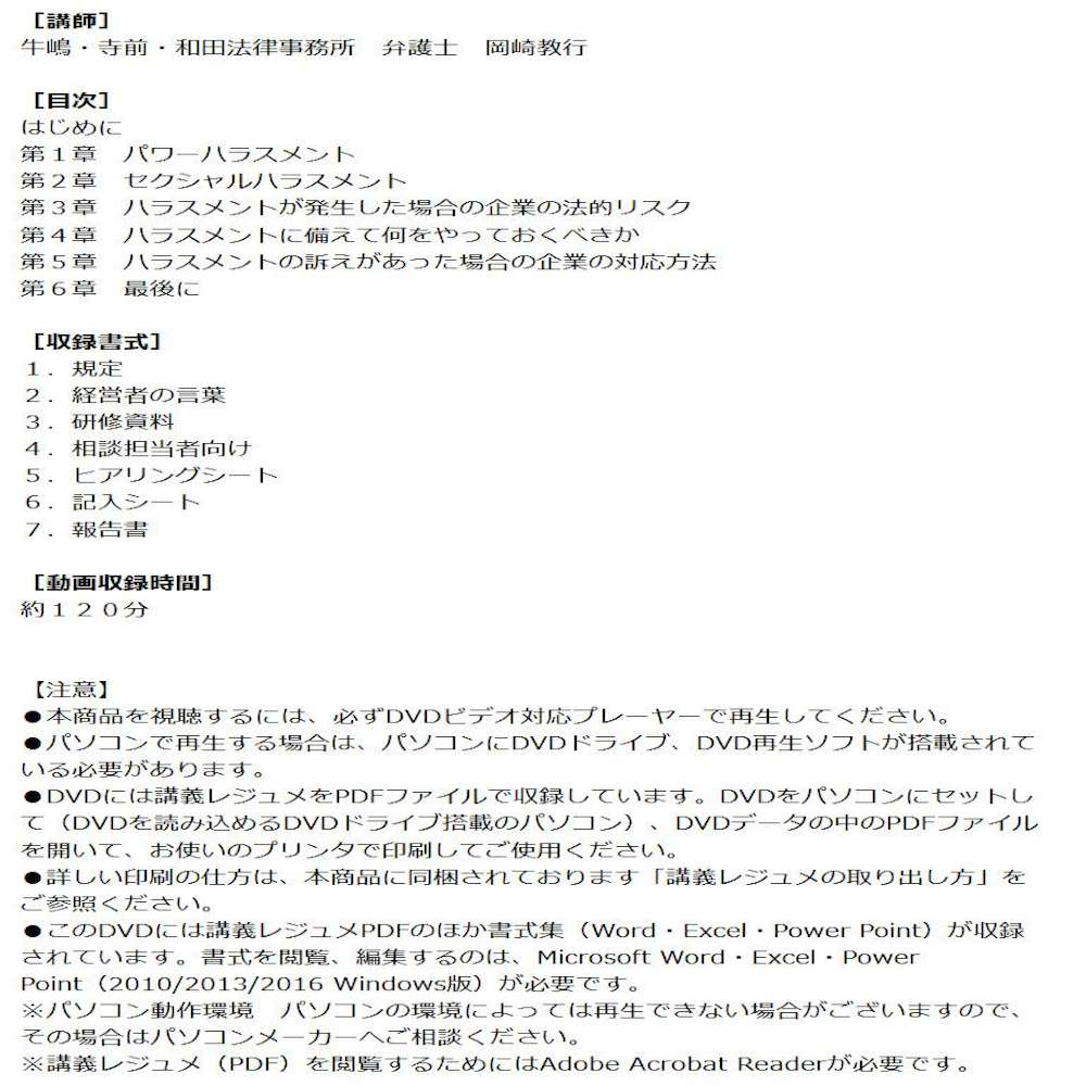 DVD 事前事後の対応がわかる 必ず知っておきたい職場のハラスメント対策 V92 分かりやすく解説! ハラスメントを発生させないために企業が事前に行っておくべき事項からハラスメントが発生した時の企業リスクと対応方法までを、裁判例を用いてわかりやすく解説!また、ハラスメントが起きたときの、事実関係の調査のやり方や裁判になった時の提出書類の、指摘される部分も踏まえて解説し、必要となる書式も収録しております。