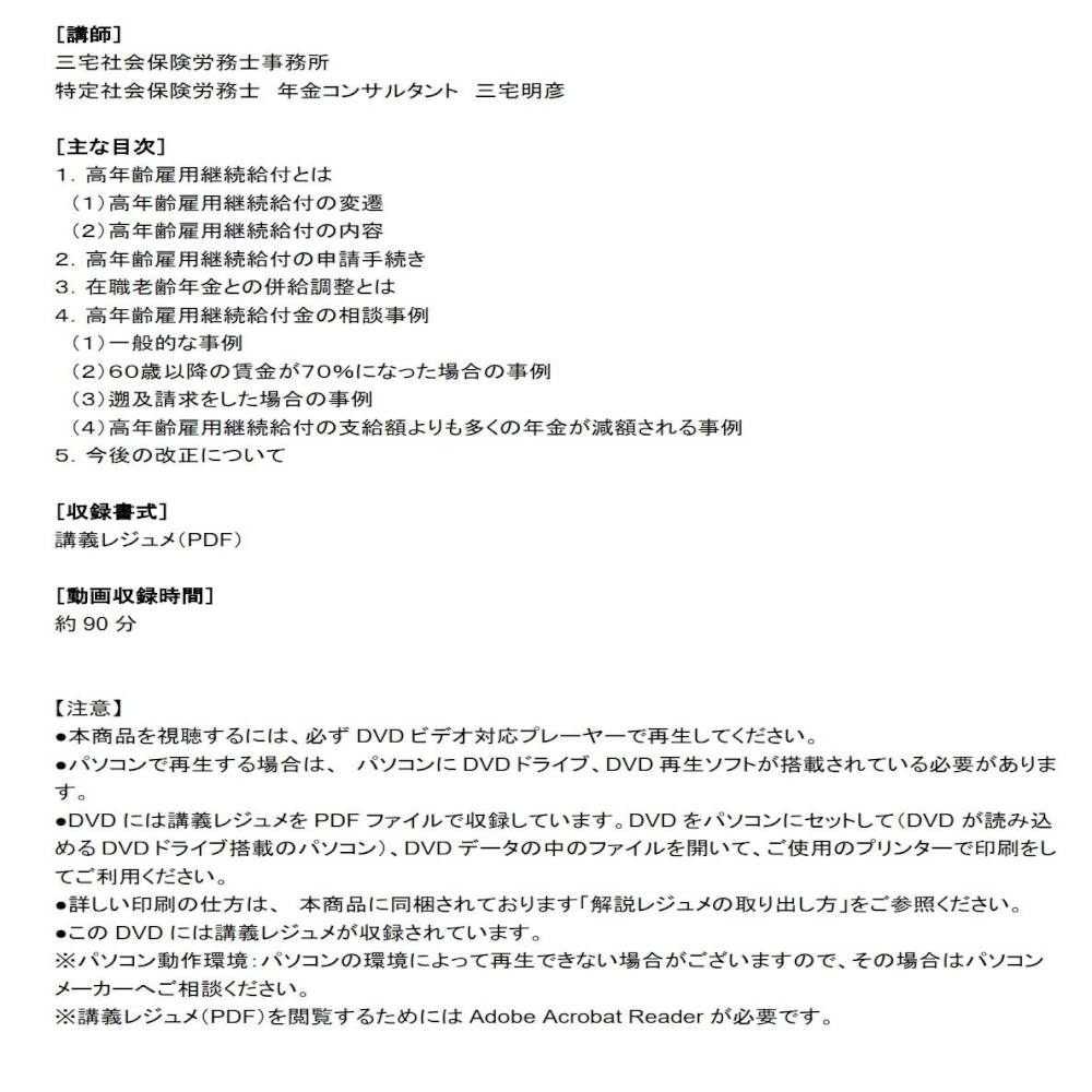 DVD 必ず知っておきたい 高年齢雇用継続給付の基本と実務上の注意点 V161 高年齢雇用継続給付制度の基本から実務を詳しく解説! 高年齢雇用継続給付制度の理解と年金との関係が正しくわかっていないと、高年齢雇用継続給付を申請したが、それ以上に年金が調整され申請しない方がよかったということにもなりかねません。本DVDでは、この高年齢雇用継続給付制度の基本から実務への影響について、よくある相談事例をもとに、実務の解説をしています。6