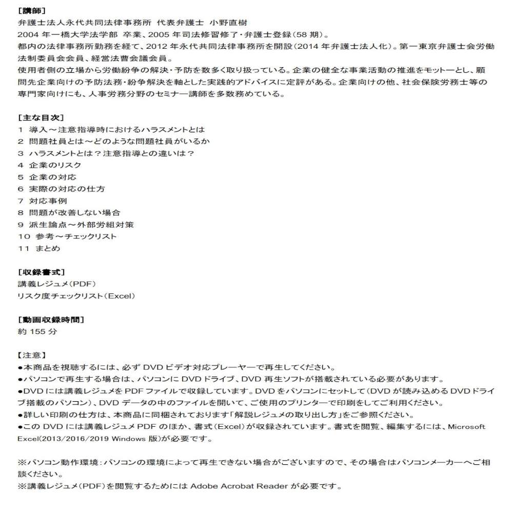DVD 上司の指導がパワハラにならないためのタイプ別問題社員対応 V162 注意指導によって生じるハラスメント問題が急増中! また、実際の対応の仕方については、注意指導を行う前に準備することや問題社員への対応のトークスクリプト、そして、注意指導の記録の残し方についても盛り込んでいます。近年では、「パワハラ」と騒がれることをあまりにもおそれ、注意指導ができなくなり、問題社員が横行してしまうケースや、問題社員に煽られて感情的になり注意指導とは関係ないことを言ってしまい、状態が悪くなるケースがでてきています。そこで、本DVDでは、注意指導とパワハラの違いや、問題社員対応について、どのような点に留意し、接していけばよいのかを、タイプ別に解説しています。