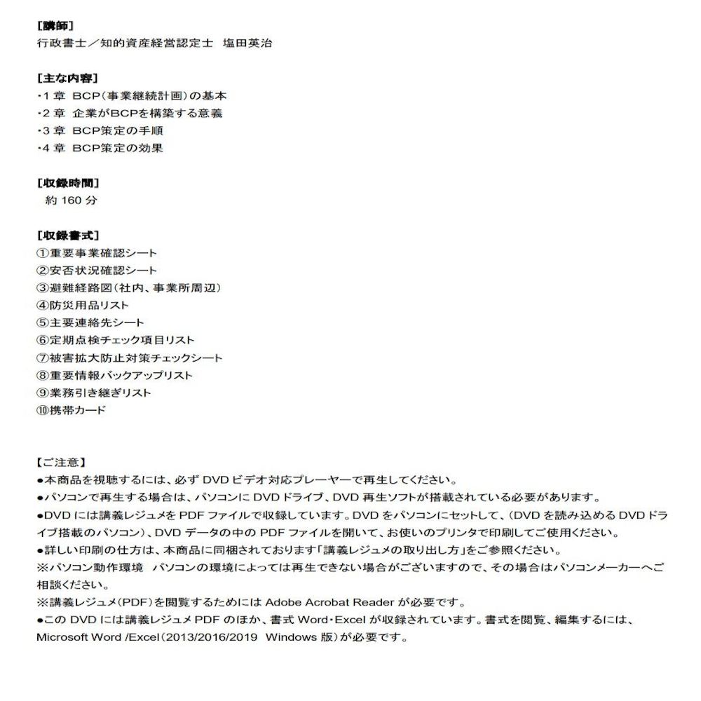 DVD 中小企業のためのBCP(事業継続計画) 策定の仕方とその手順 V 164DVDセミナーを見てすぐ一歩、BCP作成に踏み出せる! BCP(事業継続計画)とは、「組織の活動を脅かす状況を回避するための対策用の文書」のことです。本DVDでは中小企業の『BCPの作り方』から『策定したBCPを経営にどう活かすか』まで具体例を用いて解説しているだけでなく、BCP策定により対外的にアピールできること・得られる効果や認定制度、助成金についても紹介しているので防災対策の基礎を理解し、防災対策の一歩先を学ぶことができます。