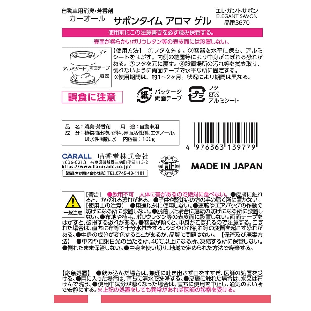 アロマ石けん香る、心やすらぐ空間 気品のあるアロマ石けんの香りを集めた消臭剤。 悪臭を感じにくくする香料“消臭アロマ”と植物消臭成分を配合。 上質な香りと消臭効果で、車内を心やすらぐ空間に。 ドリンクホルダーにピッタリな置き型タイプ。 使用期間 :約1~2ヶ月 ※使用状況により異なります。 エレガントサボン:透明感のある優しいアロマ石けんの香り